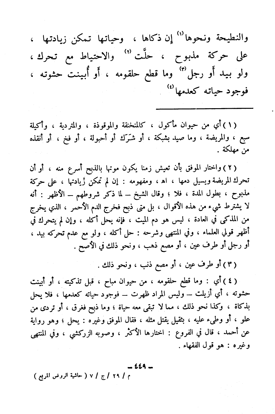 (¬2) واختار الموفق بأن تعيش زمنا يكون موتها بالذبح أسرع منه، أو أن تحرك المريضة ويسيل دمها، اهـ ومفهومه، إن لم تمكن زيادتها على حركة مذبوح بطول المدة، فلا وقال الشيخ: لما ذكر شروطهم الأظهر: أنه لا يشترط شيء من هذه الأقوال، بل متى ذبح فخرج الدم الأحمر، الذي يخرج من المذكي في العادة، ليس هو دم الميت، فإنه يحل أكله، وإن لم يتحرك في أظهر قولي العلماء، وفي المنتهى وشرحه: حل أكله ولو مع عدم تحركه بيد، أو رجل أو طرف عين، أو مصع ذهب، ونحو ذلك في الأصح.