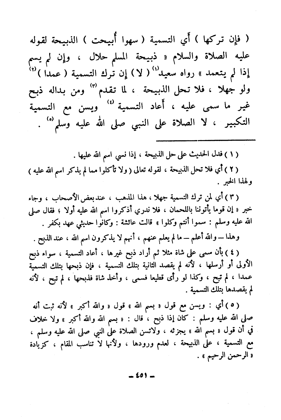 (فإن تركها) أي التسمية (سهوا أبيحت) الذبيحة لقوله عليه الصلاة والسلام: «ذبيحة المسلم حلال، وإن لم يسم إذا لم يتعمد» رواه سعيد (¬1) (لا) إن ترك التسمية (عمدا) (¬2) ولو جهلا فلا تحل الذبيحة، لما تقدم (¬3) ومن بداله ذبح غير ما سمى عليه، أعاد التسمية (¬4) ويسن مع التسمية التكبير، لا الصلاة على النبي صلى الله عليه وسلم (¬5) .
