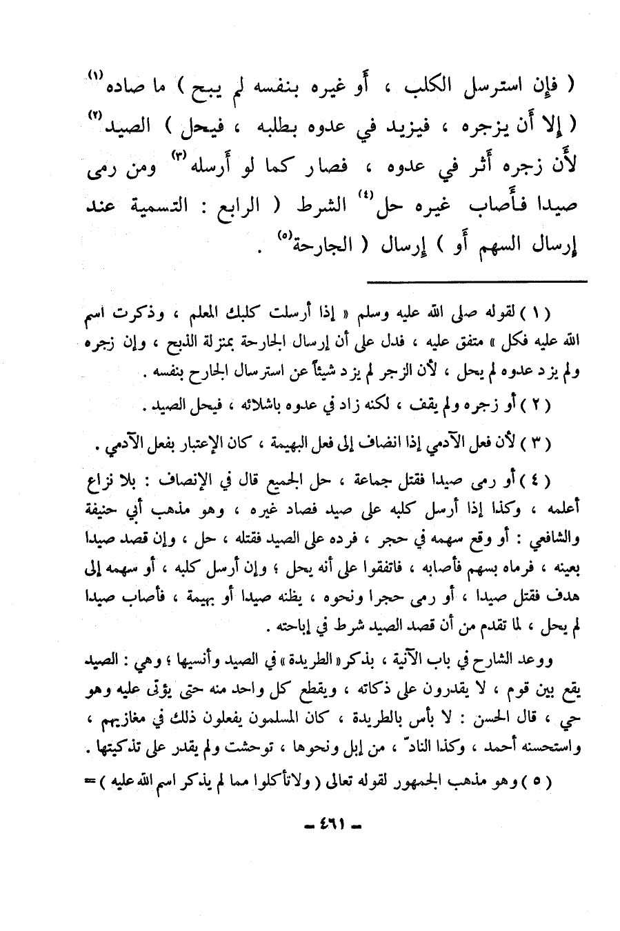 (¬4) أو رمى صيدا فقتل جماعة، حل الجميع قال في الإنصاف: بلا نزاع أعلمه، وكذا إذا أرسل كلبه على صيد فصاد غيره، وهو مذهب أبي حنيفة والشافعي: أو وقع سهمه في حجر، فرده على الصيد فقتله، حل وإن قصد صيدا بعينه فرماه بسهم فأصابه فاتفقوا على أنه يحل، وإن أرسل كلبه، أو سهمه إلى هدف فقتل صيدا، أو رمى حجرا ونحوه، يظنه صيدا أو بهيمة، فأصاب صيدا لم يحل لما تقدم من أن قصد الصيد شرط في إباحته.