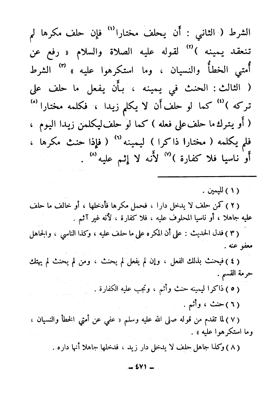 الشرط (الثاني: أن يحلف مختارا (¬1) فإن حلف مكرها لم تنعقد يمينه) (¬2) لقوله عليه الصلاة والسلام: «رفع عن أمتي الخطأ والنسيان، وما استكرهوا عليه» (¬3) الشرط الثالث: الحنث في يمينه بأن يفعل ما حلف على تركه (¬4) كما لو حلف أن لا يكلم زيدا، فكلمه مختارا (¬5) أو يترك ما حلف على فعله كما لو حلف ليكلمن زيدا اليوم، فلم يكلمه (مختارا ذاكرا) ليمينه (¬6) (فإذا حنث مكرها، أو ناسيا فلا كفارة) (¬7) لأنه لا إثم عليه (¬8) .