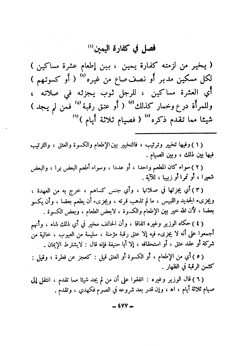 (يخير من لزمته كفارة يمين، بين إطعام عشرة مساكين) لكل مسكين مدبر أو نصف صاع من غيره (¬2) (أو كسوتهم) أي العشرة مساكين، للرجل ثوب يجزئه في صلاته، وللمرأة درع وخمار كذلك (¬3) (أو عتق رقبة (¬4) فمن لم يجد) شيئا مما تقدم ذكره (¬5) (فصيام ثلاثة أيام) (¬6) .