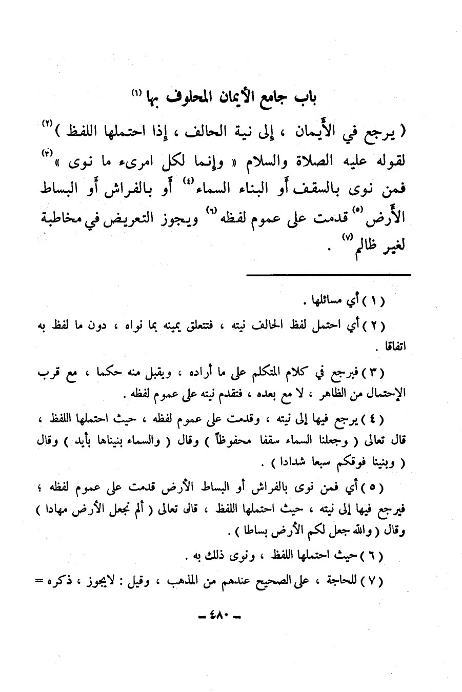 (يرجع في الأيمان، إلى نية الحالف، إذا احتملها اللفظ) (¬2) لقوله عليه الصلاة والسلام: «وإنما لكل امرئ ما نوى» (¬3) فمن نوى بالسقف أو البناء السماء (¬4) أو بالفراش أو البساط الأرض (¬5) قدمت على عموم لفظه (¬6) ويجوز التعريض في مخاطبة لغير ظالم (¬7) .