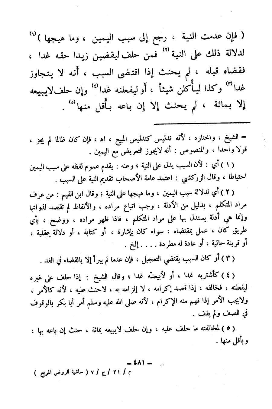 (¬2) أي لدلالة سبب اليمين، وما هيجها على النية، وقال ابن القيم: من عرف مراد المتكلم، بدليل من الأدلة، وجب اتباع مراده، والألفاظ لم تقصد لذواتها وإنما هي أدلة يستدل بها على مراد المتكلم، فإذا ظهر مراده، ووضح بأي طريق كان عمل بمقتضاه سواء كان بإشارة، أو كتابة، أو دلالة عقلية أو قرينة حالية أو عادة له مطردة ... إلخ.