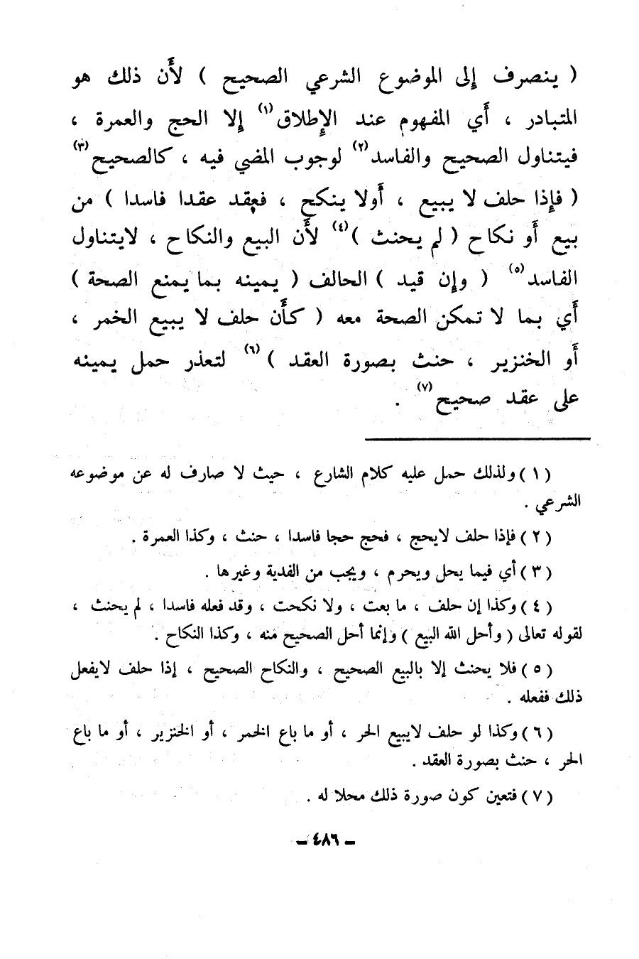 (ينصرف إلى الموضوع الشرعي الصحيح) لأن ذلك هو المتبادر، أي المفهوم عند الإطلاق (¬1) إلا الحج والعمرة، فيتناول الصحيح والفاسد (¬2) لوجوب المضي فيه، كالصحيح (¬3) (فإذا حلف لا يبيع، أو لا ينكح، فعقد عقدا فاسدا) من بيع أو نكاح (لم يحنث) (¬4) لأن البيع والنكاح لا يتناول الفاسد (¬5) .