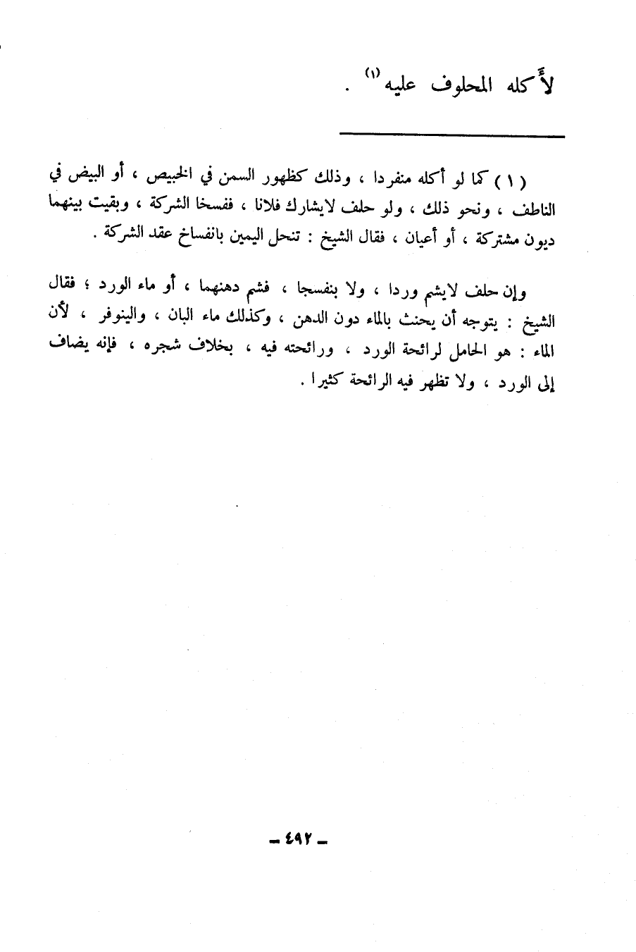 (¬1) كما لو أكله منفردا وذلك كظهور السمن في الخبيص أو البيض في الناطف ونحو ذلك، ولو حلف لا يشارك فلانا، ففسخا الشركة، وبقيت بينهما ديون مشتركة، أوأعيان فقال الشيخ: تنحل اليمين بانفساخ عقد الشركة.