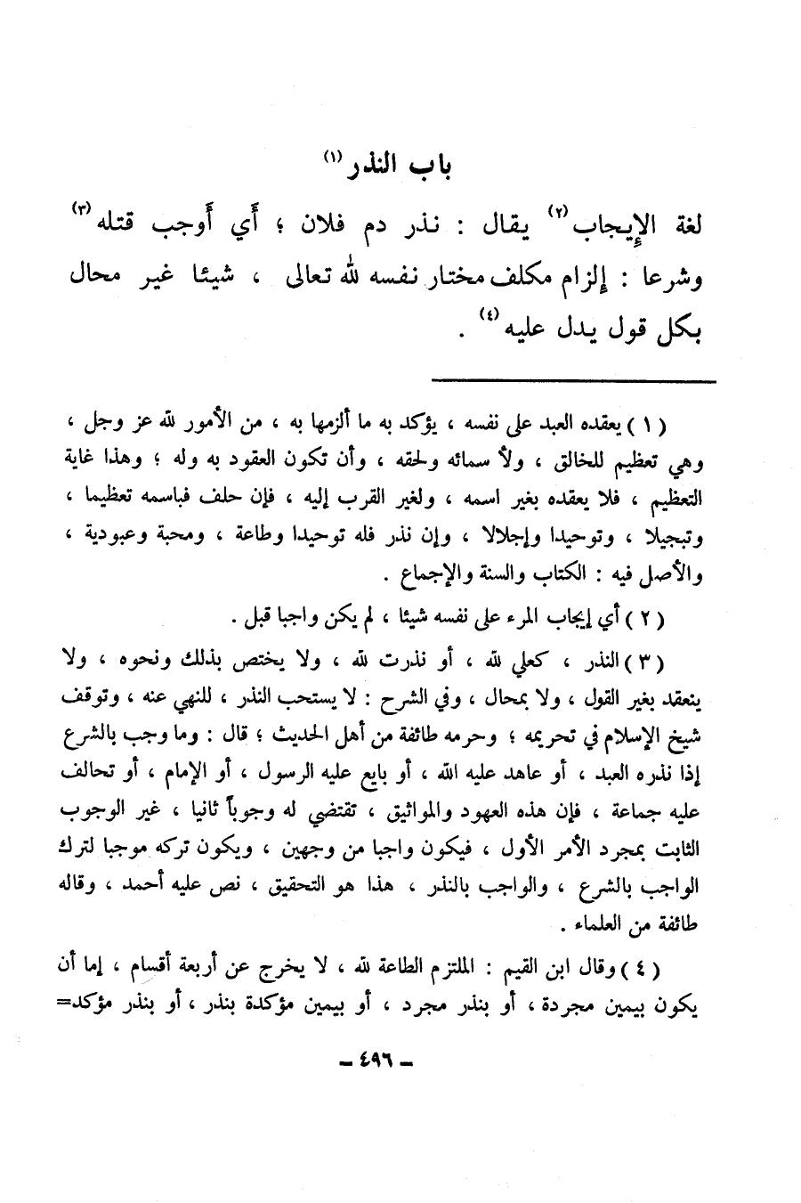 (¬4) وقال ابن القيم: الملتزم الطاعة لله، لا يخرج عن أربعة أقسام، إما أن يكون بيمين مجردة، أو بنذر مجرد، أو بيمين مؤكدة بنذر، أو بنذر مؤكد