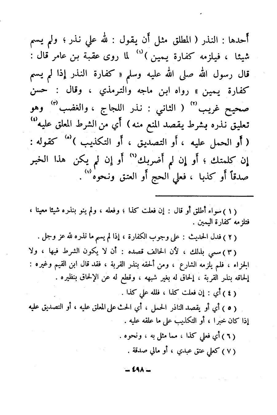 (الثاني: نذر اللجاج، والغضب (¬3) وهو تعليق نذره بشرط يقصد المنع منه) أي من الشرط المعلق عليه (¬4) (أو الحمل عليه، أو التصديق، أو التكذيب) (¬5) كقوله إن كلمتك، أن إن لم أضربك (¬6) أو إن لم يكن هذا الخبر صدقا أو كذبا، فعلي الحج أو العتق ونحوه (¬7) .