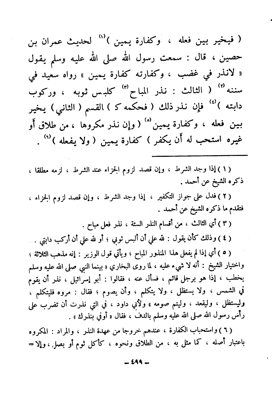 (الثالث: نذر المباح (¬3) كلبس ثوبه، وركوب دابته) (¬4) فإن نذر ذلك (فحكمه كـ) القسم (الثاني) يخير بين فعله، وكفارة يمين (¬5) (وإن نذر مكروها من طلاق أو غيره استحب له أن يكفر) كفارة يمين (ولا يفعله) (¬6) .