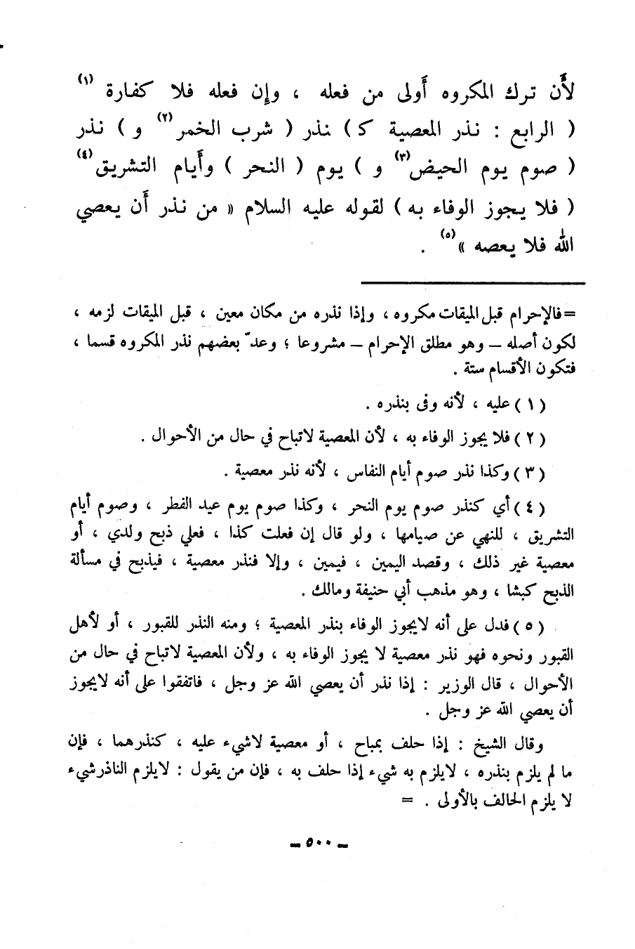 (¬4) أي كنذر صوم يوم النحر، وكذا صوم يوم عيد الفطر، وصوم أيام التشريق، للنهي عن صيامها، ولو قال إن فعلت كذا، فعلي ذبح ولدي، أو معصية غير ذلك، وقصد اليمين، فيمين، وإلا فنذر معصية، فيذبح في مسألة الذبح كبشا، وهو مذهب أبي حنيفة ومالك.