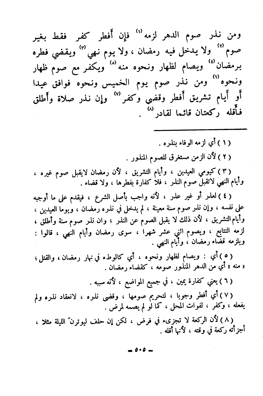 (¬4) لعذر أو غير عذر، لأنه واجب بأصل الشرع، فيقدم على ما أوجبه على نفسه، وإن نذر صوم سنة معينة، لم يدخل في نذره رمضان، ويوما العيدين، وأيام التشريق، لأن ذلك لا يقبل الصوم عن النذر، وإن نذر صوم سنة وأطلق، لزمه التتابع، ويصوم أثنى عشر شهرا، سوى رمضان وأيام النهي، قالوا: ويلزمه قضاء رمضان وأيام النهي.