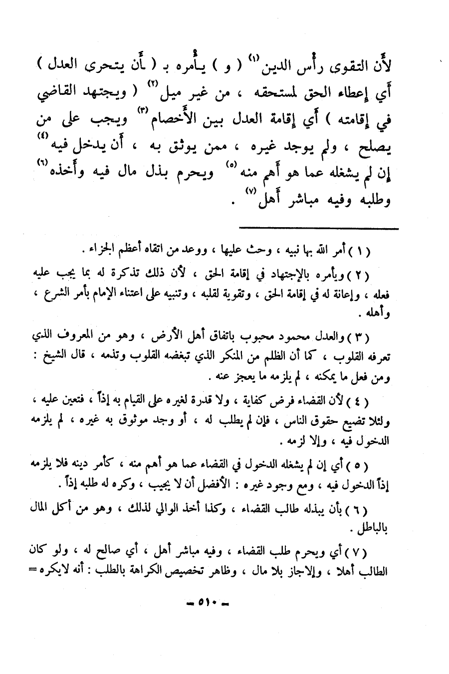 (و) يأمره بـ (أن يتحرى العدل) أي إعطاء الحق لمستحقه، من غير ميل (¬2) (ويجتهد القاضي في إقامته) أي إقامة العدل بين الأخصام (¬3) ويجب على من يصلح، ولم يوجد غيره، ممن يوثق به، أن يدخل فيه (¬4) إن لم يشغله عما هو أهم منه (¬5) ويحرم بذلك مال فيه وأخذه (¬6) وطلبه وفيه مباشر أهل (¬7) .