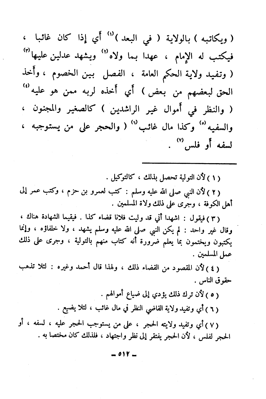 (ويكاتبه) بالولاية (في البعد) (¬1) أي إذا كان غائبا، فيكتب له الإمام عهدا بما ولاه (¬2) ويشهد عدلين عليها (¬3) (وتفيد ولاية الحكم العامة، الفصل بين الخصوم، وأخذ الحق لبعضهم من بعض) أي أخذه لربه ممن هو عليه (¬4) (والنظر في أموال غير الراشدين) كالصغير والمجنون، والسفيه (¬5) وكذا مال غائب (¬6) (والحجر على من يستوجبه، لسفه أو فلس (¬7) .