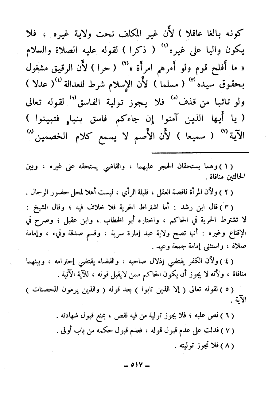 (¬3) قال ابن رشد: أما اشتراط الحرية فلا خلاف فيه، وقال الشيخ: لا تشترط الحرية في الحاكم، واختاره أبو طالب، وابن عقيل، وصرح في الإقناع وغيره، أنها تصح ولاية عبد إمارة سرية، وقسم صدقة وفيء، وإمامة صلاة، واستثنى إمامة جمعة وعيد.