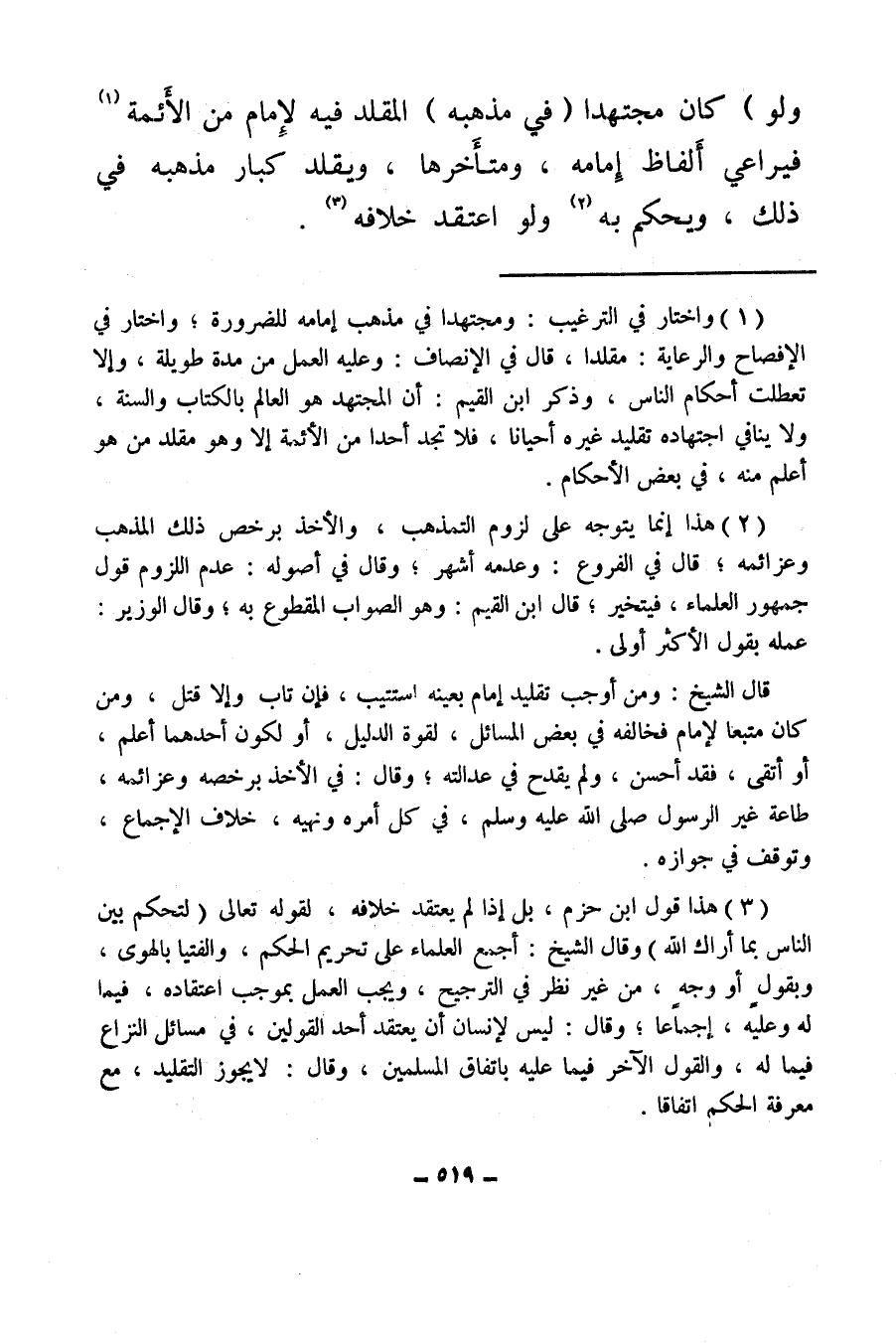 (¬1) واختار في الترغيب، ومجتهد في مذهب إمامه للضرورة، واختار في الإفصاح والرعاية: مقلدا، قال في الإنصاف: وعليه العمل من مدة طويلة، وإلا تعطلت أحكام الناس، وذكر ابن القيم: أن المجتهد هو العالم بالكتاب والسنة، ولا ينافي اجتهاده تقليد غيره أحيانا، فلا تجد أحدا من الأئمة إلا وهو مقلد من هو أعلم منه، في بعض الأحكام.