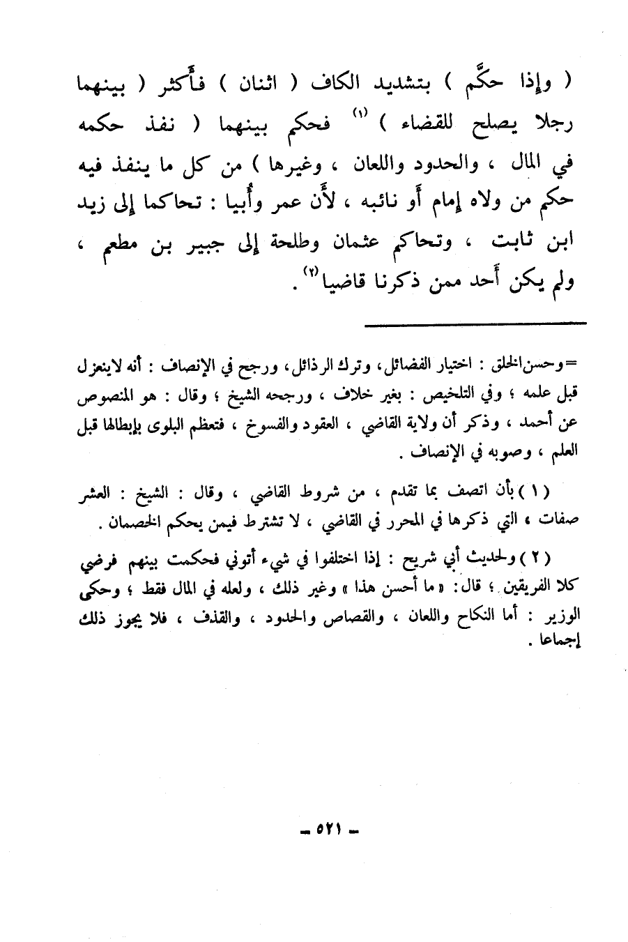 (¬2) ولحديث أبي شريح: إذا اختلفوا في شيء أتوني فحكمت بينهم فرضي كلا الفريقين، قال: ما أحسن هذا وغير ذلك وعلله في المال فقط، وحكي الوزير: أما النكاح واللعان، والقصاص والحدود، والقذف، فلا يجوز ذلك إجماعا.
