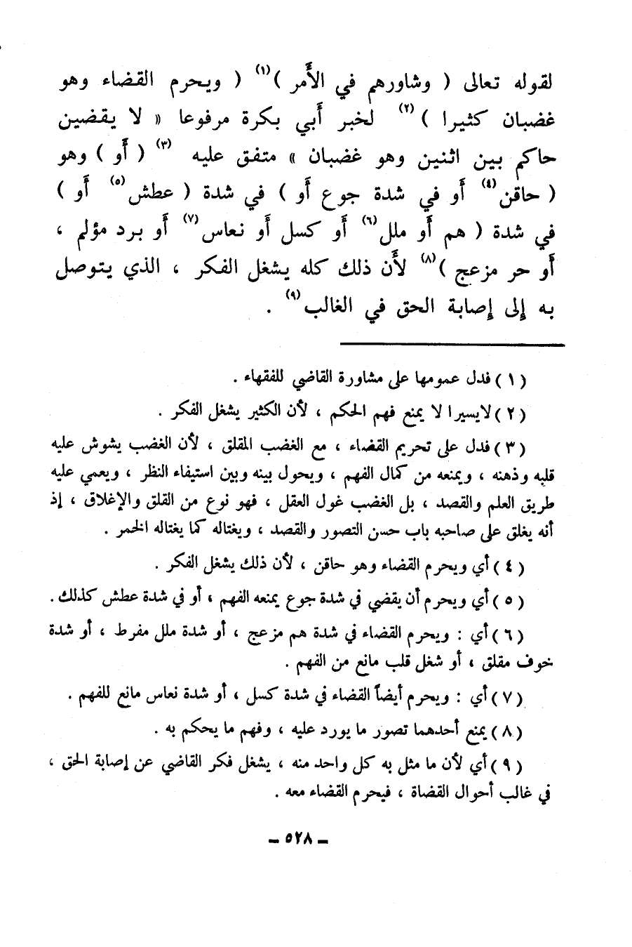 (¬9) أي لأن ما مثل به كل واحد منه، يشغل فكر القاضي عن إصابة الحق، في غالب أحوال القضاة فيحرم القضاء معه.