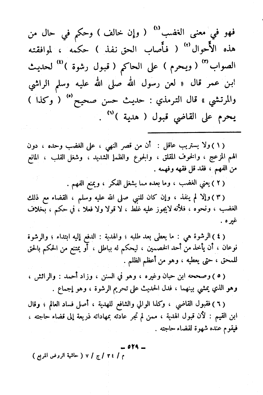 فهو في معنى الغضب (¬1) (وإن خالف) وحكم في حال من هذه الأحوال (¬2) (فأصاب الحق نفذ) حكمه لموافقته الصواب (¬3) (ويحرم) على الحاكم (قبول رشوة) (¬4) لحديث ابن عمر قال: لعن رسول الله صلى الله عليه وسلم الراشي والمرتشي، قال الترمذي: حديث حسن صحيح (¬5) (وكذا) يحرم على القاضي قبول (هدية) (¬6) .