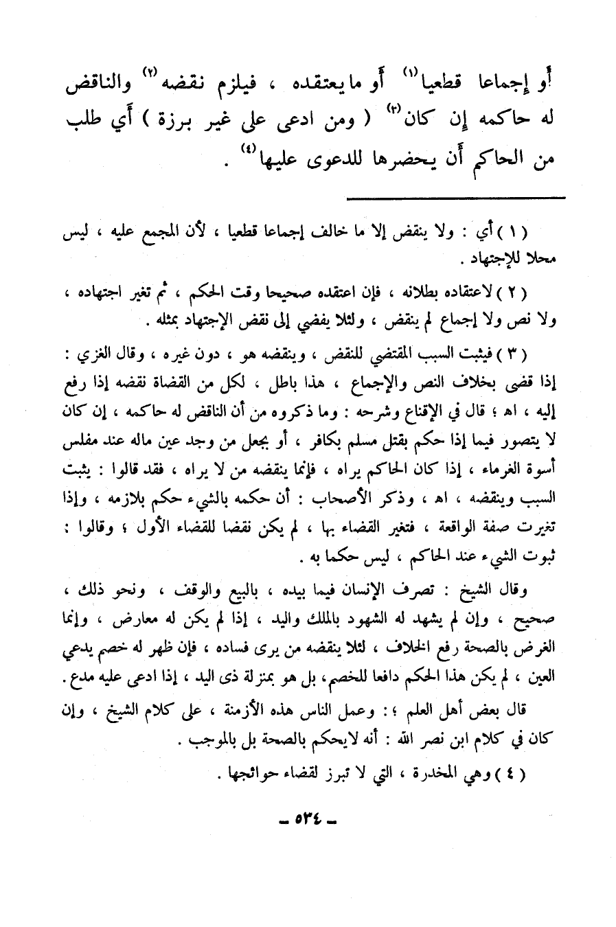(¬3) فيثبت السبب المقتضي للنقض، وينقضه هو، دون غيره، وقال الغزي، إذا قضى بخلاف النص والإجماع، هذا باطل، لكل من القضاة نقضه إذا رفع إليه اهـ قال في الإقناع وشرحه، وما ذكروه من أن الناقض له حاكمه، إن كان لا يتصوره فيما إذا حكم بقتل مسلم بكافر، أو يجعل من وجد عين ماله عند مفلس أسوة الغرماء، إذا كان الحاكم يراه، فإنما ينقضه من لا يراه، فقد قالوا: يثبت السبب وينقضه اهـ وذكر الأصحاب، أن حكمه بالشيء حكم يلازمه، وإذا تغيرت صفة الواقعة، فتغير القضاء بها، لم يكن نقضا للقضاء الأول، وقالوا: ثبوت الشيء عند الحاكم ليس حكما به.