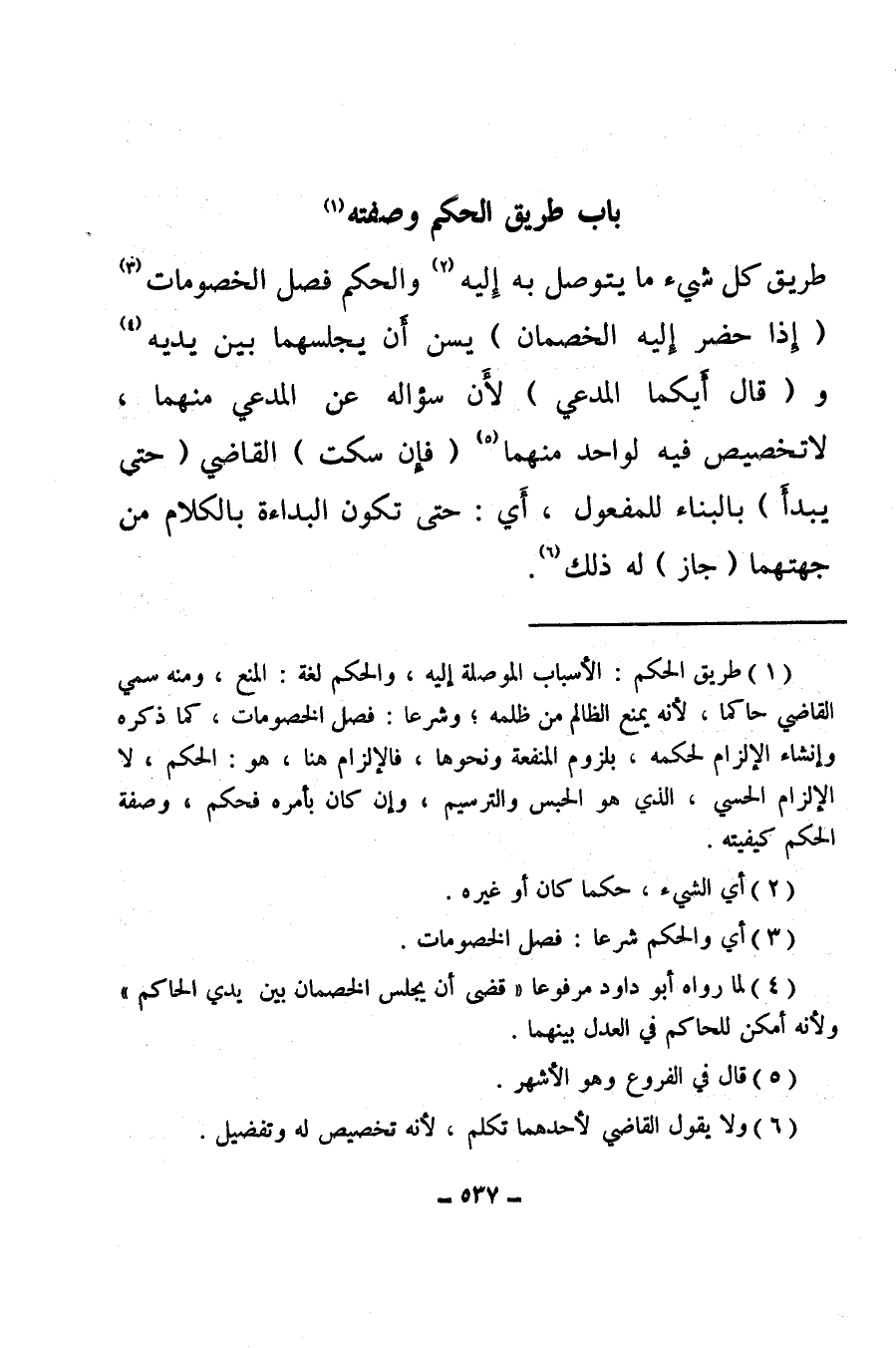 (¬1) طريق الحكم، الأسباب الموصلة إليه، والحكم لغة: المنع، ومنه سمي القاضي حاكما، لأنه يمنع الظالم من ظلمه، وشرعا: فصل الخصومات، كما ذكره وإنشاء الإلزام لحكمه، بلزوم المنفعة ونحوها، فالإلزام هنا، هو: الحكم، لا الإلزام الحسي، الذي هو الحبس والترسيم، وإن كان بأمره فحكم، وصفة الحكم كيفيته.