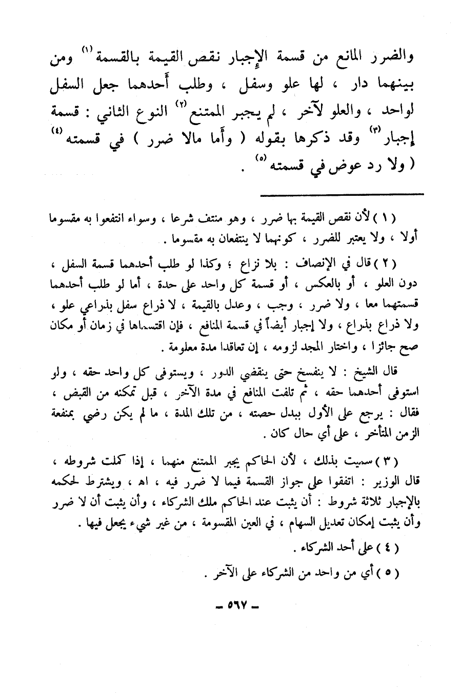 (¬3) سميت بذلك، لأن الحاكم يجبر الممتنع منهما، إذا كملت شروطه، قال الوزير: اتفقوا على جواز القسمة فيما لا ضرر فيه، اهـ ويشترط لحكمه بالإجبار ثلاثة شروط: أن يثبت عند الحاكم ملك الشركاء، وأن يثبت أن لا ضرر وأن يثبت إمكان تعديل السهام، في العين المقسومة، من غير شيء يجعل فيها.