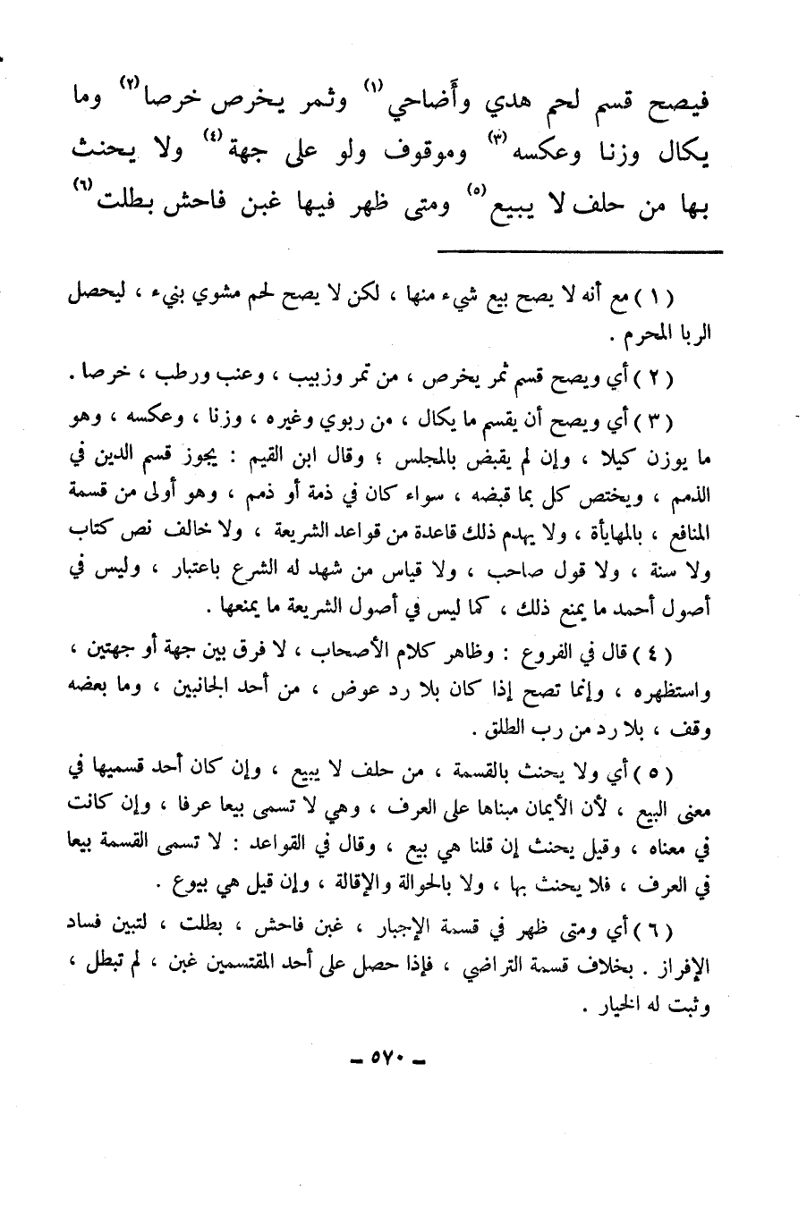 (¬5) أي ولا يحنث بالقسمة، من حلف لا يبيع، وإن كان أحد قسميها في معنى البيع، لأن الإيمان مبناها على العرف، وهي لا تسمى بيعا عرفا، وإن كانت في معناه، وقيل يحنث إن قلنا هي بيع، وقال في القواعد: لا تسمى القسمة بيعا في العرف فلا يحنث بها، ولا بالحوالة والإقالة، وإن قيل هي بيوع.