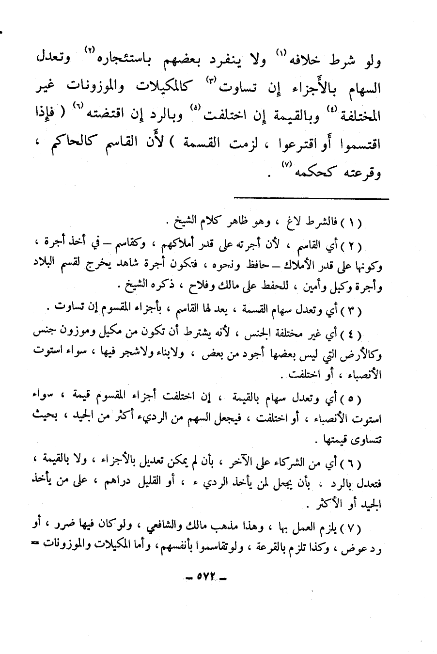 (¬7) يلزم العمل بها، وهذا مذهب مالك والشافعي، ولو كان فيها ضرر، أو رد عوض، وكذا تلزم بالقرعة، ولو تقاسموا بأنفسهم، وأما المكيلات والموزونات المتساوية من كل وجه، فقال الشيخ: إذا قسمت لا يحتاج فيها إلى قرعة، نعم، الا الابتداء بالكيل، أو الوزن لبعض الشركاء، ينبغي أن يكون بالقرعة ثم إذا خرجت لصاحب الأكثر، فهل يوفى جميع حقه؟ الأوجه أن يوفى الجميع، كما يواصل مثله في العقار، بين أنصبائه، لأن عليه في التفريق ضررا، وحقه من جنس واحد.