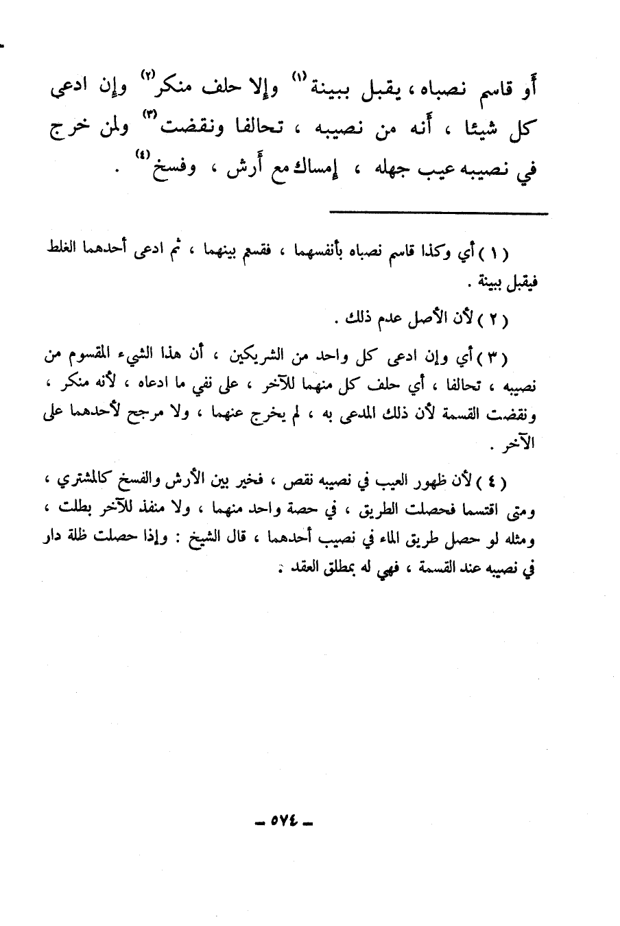 (¬3) أي وإن ادعى كل واحد من الشريكين أن هذا الشيء المقسوم من نصيبه تحالفا أي حلف كل منهما للآخر، على نفي ما ادعاه لأنه منكر، ونقضت القسمة لأن ذلك المدعى به، لم يخرج عنهما، ولا مرجح لأحدهما على الآخر.
