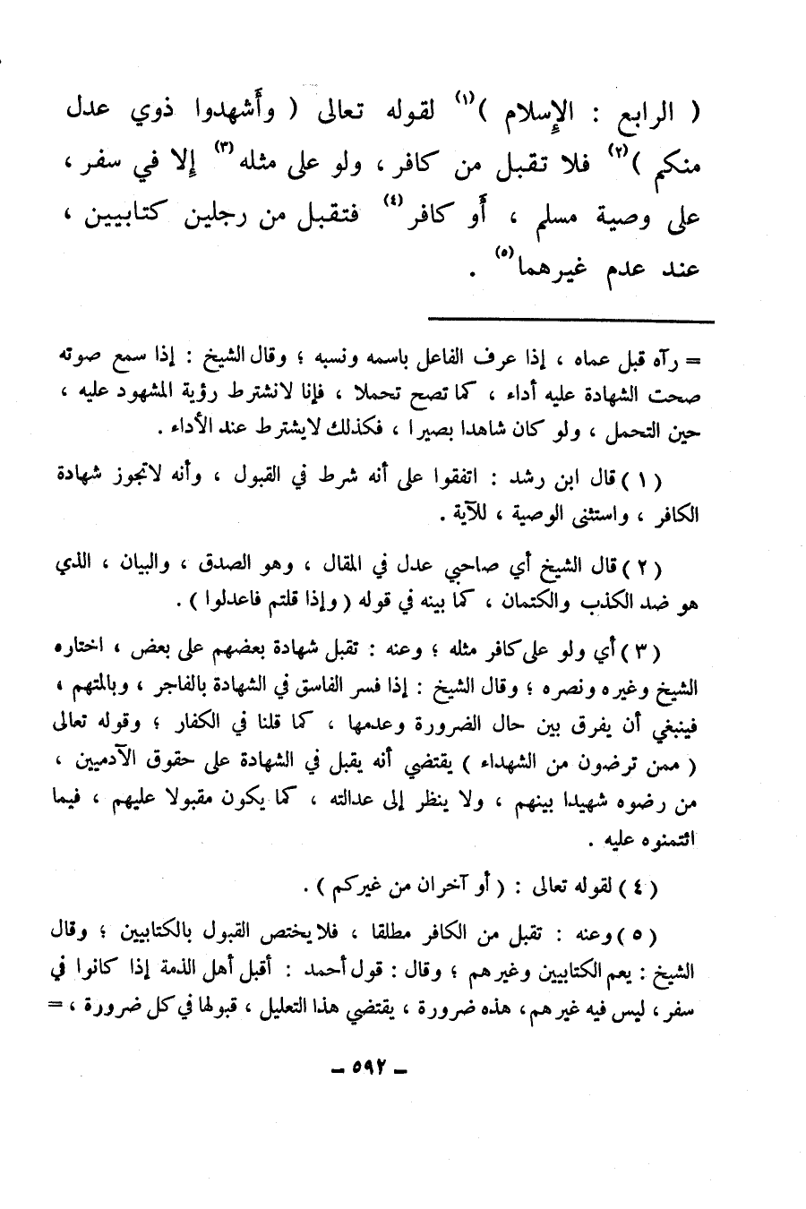 (الرابع: الإسلام) (¬1) لقوله تعالى: {وَأَشْهِدُوا ذَوَيْ عَدْلٍ مِنْكُمْ} (¬2) فلا تقبل من كافر، ولو على مثله (¬3) إلا في سفر، على وصية مسلم أو كافر (¬4) فتقبل من رجلين كتابيين، عند عدم غيرهما (¬5) .