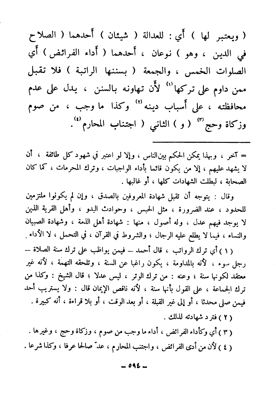 (ويعتبر لها) أي: للعدالة (شيئان) أحدهما (الصلاح في الدين وهو) نوعان، أحدهما (أداء الفرائض) أي الصلوات الخمس، والجمعة (بسننها الراتبة فلا تقبل ممن داوم على تركها (¬1) لأن تهاونه بالسنن، يدل على عدم محافظته على أسباب دينه (¬2) وكذا ما وجب، من صوم وزكاة وحج (¬3) (و) الثاني (اجتناب المحارم (¬4))