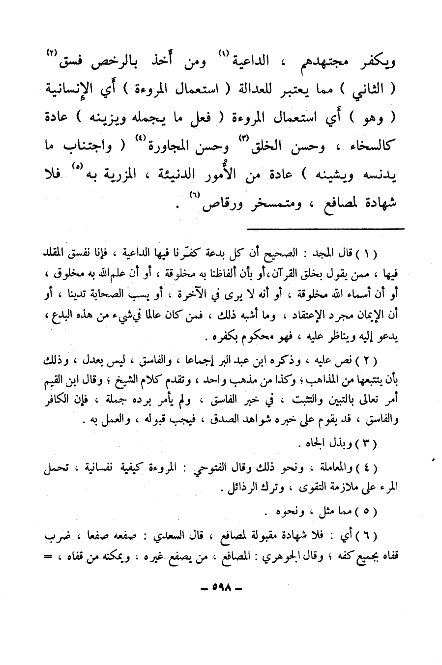 (¬1) قال المجد: الصحيح أن كل بدعة كفرنا فيها الداعية، فإنا نفسق المقلد فيه، ممن يقول بخلق القرآن، أو بأن ألفاظنا به مخلوقة، أو أن علم الله به مخلوق، أو أن أسماء الله مخلوقة، أو أنه لا يرى في الآخرة، أو يسب الصحابة تدينا، أو أن الإيمان مجرد الاعتقاد، وما أشبه ذلك فمن كان عالما في شيء من هذه البدع، يدعو إليه ويناظر عليه فهو محكوم بكفره.