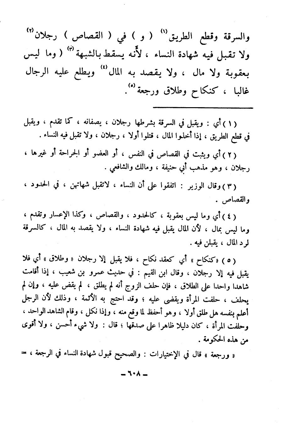 والسرقة وقطع الطريق (¬1) (و) في (القصاص) رجلان (¬2) ولا تقبل فيه شهادة النساء، لأنه يسقط بالشبهة (¬3) (وما ليس بعقوبة ولا مال، ولا يقصد به المال (¬4) ، ويطلع عليه الرجال غالبا، كنكاح وطلاق ورجعة (¬5) .
