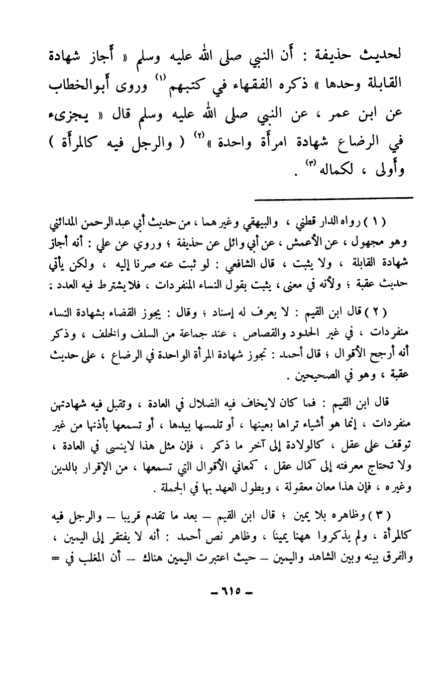 (¬2) قال ابن القيم: لا يعرف له إسناد وقال: يجوز القضاء بشهادة النساء منفردات في غير الحدود والقصاص، عند جماعة من السلف والخلف، وذكر أنه أرجح الأقوال، قال أحمد: تجوز شهادة المرأة الواحدة في الرضاع، على حديث عقبة وهو في الصحيحين.