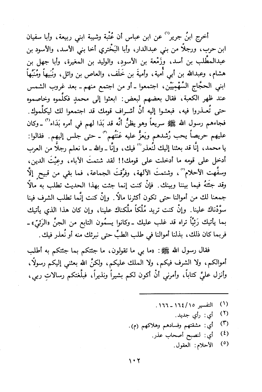 أخرح بن جرير عن ابن عباس أن عتبة وشيبة ابني ربيعة، وأبا سفيان بن حرب، ورجلاً من بني عبد الدار، وأبا البَخْتري أخا بني الأسد، والأسود بن عبد المطَّلب بن أسد، وزَمْعة بن الأسود، والوليد بن المغيرة، وأبا جهل بن هشام، وعبد الله بن أبي أُمية، وأميةَ بن خلف، والعاص بن وائل، ونبيها ومُنَبَّها ابني الحجَّاج السَّهُمِيَيْن، اجتمعوا - أو من اجتمع منهم - بعد غروب الشمس عند ظهر الكعبة، فقال بعضهم لبعض: ابعثوا إلى محمد فكلِّموه وخاصموه حتى تُعذروا فيه، فبعثوا إليه أنَّ أشراف قومك قد اجتمعوا لك ليكلِّموك، فجاءهم رسول الله صلى الله عليه وسلم سريعاً وهو يظنُّ أنَّه قد بَدَا في أمره بَدَاء - وكان عليهم حرصاً يحب رُشدهم ويَعزُّ عليه عَنَتُهم - حتى جلس إليهم. فقالوا: يا محمد، إنَّا قد بعثنا إليك لنُعذِر فيك، وإِنَّا - والله - ما نعلم رجلاً من العرب أدخل على قومه ما أدخلت على قومك لقد شتمتَ الآباء، وعبتَ الدين، وسفَّهت الأحلام، وشتمتَ الآلهة، وفرّقتَ الجماعة، فما بقي من قبيح إلا وقد جئته فيما بيننا وبينك. فإنْ كنت إنما جئت بهذا الحديث تطلب به مالاً جمعنا لك من أموالنا حتى تكون أكثرنا مالاً. وإنْ كنت إنَّما تطلب الشرف فينا سوَّدْناك علينا. وإنْ كنت تريد ملكاً ملَّكناك علينا. وإِن كان هذا الذي يأتيك بما يأتيك رَئِيَّاً تراه قد غلب عليك - وكانوا يسمُون التابع من الجنِّ «الرَئيّ» - فربما كان ذلك، وبذلنا أموالنا في طلب الطبِّ حتى نبرئك منه أو نُعذر فيك.