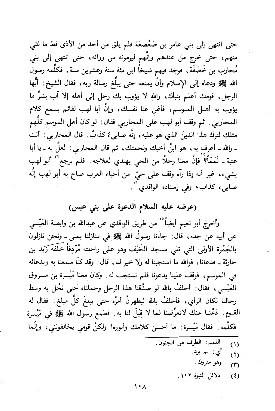 وأخرج أبو نعيم (ص 102) أيضاً من طريق الواقدي عن عبد الله بن وابصة العبسي عن أبيه عن جده قال: جاءنا رسول الله صلى الله عليه وسلم في منازلنا بمنى - ونحن نازلون بالجَمْرة الأولى التي تلي مسجد الخَيْف وهو على راحلته مُرْدِفاً خلفه زيد بن حارثة - فدعانا، فوالله ما استجبنا له ولا خير لنا، قال: وقد كنّا سمعنا به وبدعائه في الموسم، فوقف علينا يدعونا فلم نستجب له. وكان معنا مَيْسرة بن مسروق العبسي، فقال: أحلف بالله لو صدَّقنا هذا الرجل وحلمناه حتى نحُل به وسط رحالنا لكان الرأي، فأحلف بالله ليظهرنَّ أمره حتى يبلغ كلَّ مبلغ. فقال له القوم. دَعْنا عنك لا تعرِّضنا لما لا قِبَلَ لنا به، فطمع رسول الله صلى الله عليه وسلم في مَيْسرة فكلَّمه. فقال مَيْسرة: ما أحسن كلامك وأنوره ولكنَّ قومي يخالفونني، وإنَّا