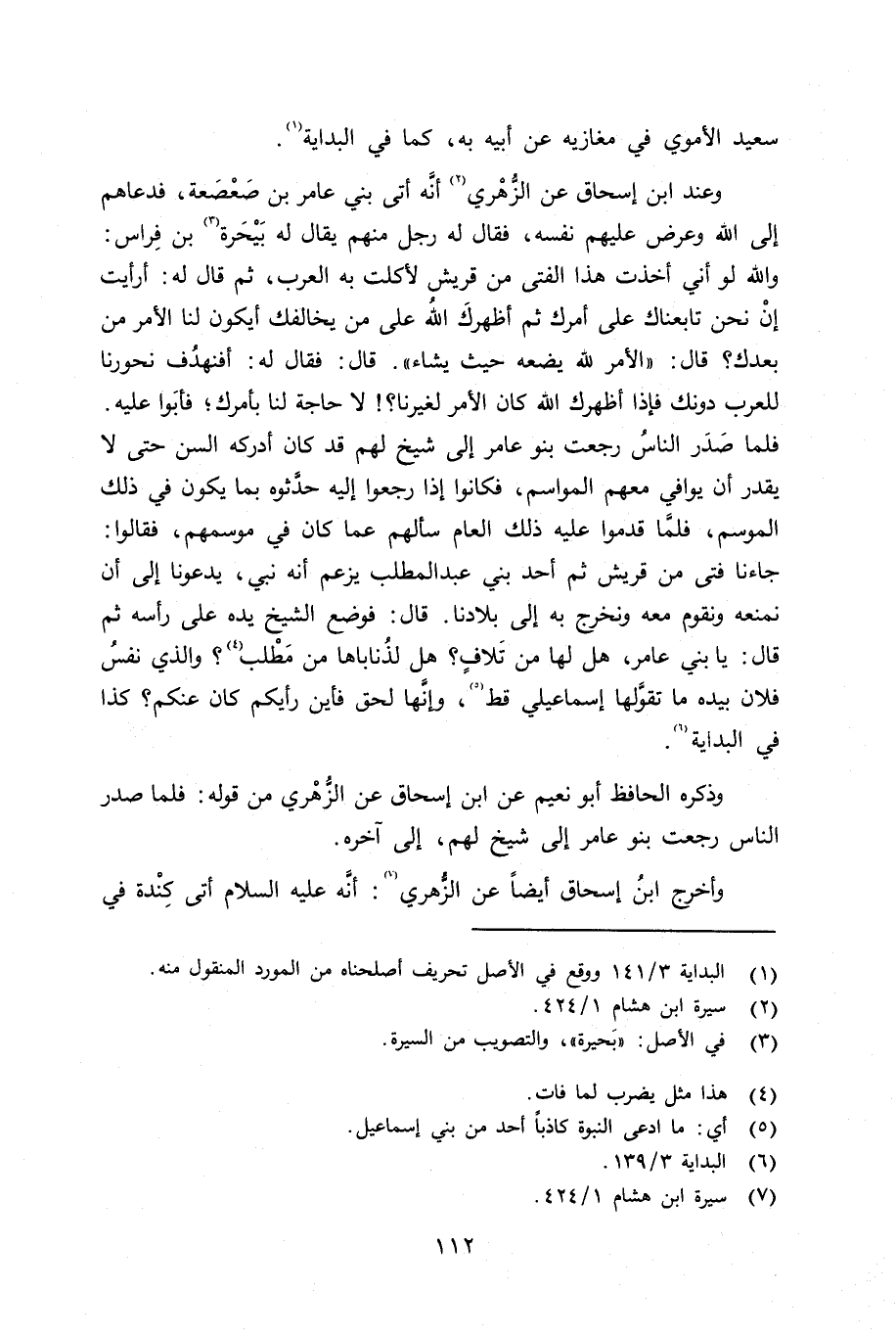 وعند ابن إسحاق عن الزُّهْري أنَّه أتى بني عمر بن صَعْصَعة، فدعاهم إلى الله وعرض عليهم نفسه. فقال له رجل منهم - يقال له بَحيرة ابن فراس -: والله لو أني أخذت هذا الفتى من قريش لأكلت به العرب، ثم قال له: أَرأيت إنْ نحن تابعناك على أمرك ثم أظهرك الله على من يخالفك أيكون لنا الأمر من بعدك؟ قال: «الأمر لله يضعه حيث يشاء» . قال: فقال له: أفنهدُف نحورنا للعرب دونك فإذا أظهرك الله كان الأمر لغيرنا؟ لا حاجة لنا بأمرك؛ فأبَوا عليه. فلما صَدَر الناس رجعت بنو عامر إلى شيخ لهم قد كان أدركه السن حتى لا يقدر أن يوافي معهم المواسم، فكانوا إذا رجعوا إليه حدَّثوه بما يكون في ذلك الموسم. فلما قدمونا عليه ذلك العام سألهم عما كان في موسمهم فقالوا: جاءنا فتى من قريش ثم أحد بني عبد المطلب يزعم أنه نبي، يدعونا إلى أن نمنعه ونقوم معه ونخرج به إلى بلادنا. قال: فوضع الشيخ يده على رأسه ثم قال: يا بني عامر، هل لها من تلاف؟ هل لذُناباها من مطلب؟ والذي نفسُ فلان بيده ما تقوَّلها إسماعيلي قط، وإنَّها لحق فأين رأيكم كان عنكم؟. كذا في البداية.