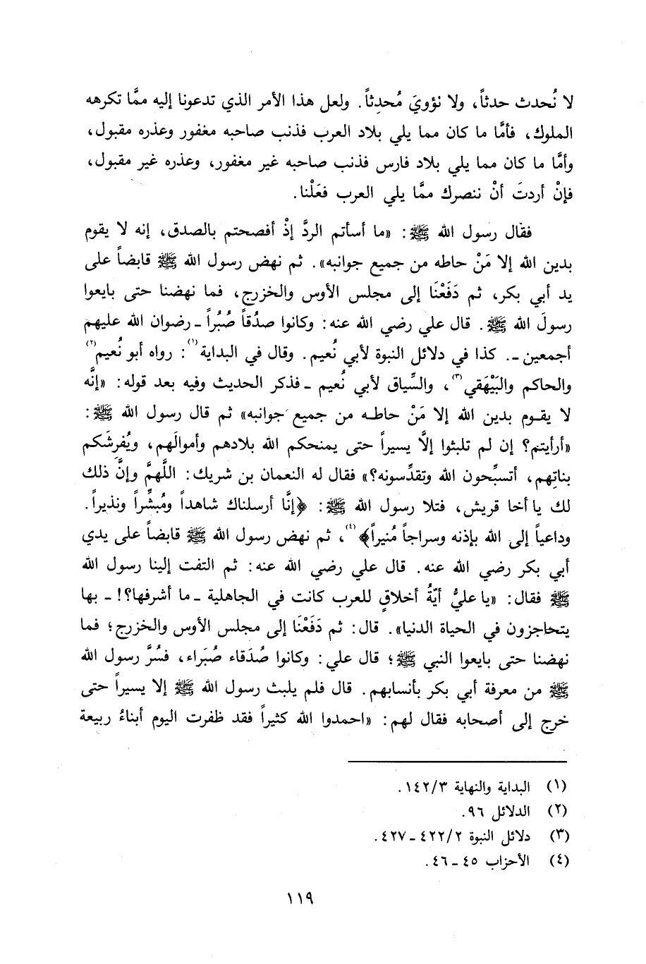 فقال رسول الله صلى الله عليه وسلم «ما أسأتم الردَّ إذْ أفصحتم بالصدق، إِنه لا يقوم بدين الله إلا مَنْ حاطه من جميع جوانبه» . ثم نهضت قابضاً على يد أبي بكر، ثم دفعنا إِلى مجلس الأوس والخزرج، فما نهضنا حتى بايعوا رسول الله صلى الله عليه وسلم قال علي رضي الله عنه: وكان صدُقاً صُبُراً - رضوان الله عليهم أجمعين -. كذا في دلائل النبوة لأبي نُعيم. وقال في البداية: رواه أبو نُعيم والحاكم والبيهقي، والسِّياق لأبي نُعيم - فذكر الحديث وفيه بعد قوله: «إنَّه لا يقوم بدين الله إلا مَنْ حاطه من جميع جوانبه» ثم قال رسول الله صلى الله عليه وسلم «أرأيتم؟ إِن لم تلبثوا إلا يسيراً حتى يمنحكم الله بلادهم وأموالهم، ويُفرشَكم بناتِهم، أتسبِّحون الله وتقدِّسونه؟» فقال له النعمان بن شريك: اللَّهمَّ وإِنَّ ذلك لك يا أخا قريش، فتلا رسول الله صلى الله عليه وسلم {ياأَيُّهَا النَّبِىُّ إِنَّآ أَرْسَلْنَاكَ شَاهِداً وَمُبَشّراً وَنَذِيراً وَدَاعِياً إِلَى اللَّهِ بِإِذْنِهِ وَسِرَاجاً مُّنِيراً} (الأحزاب: 45، 46) ثم نهض رسول الله صلى الله عليه وسلم قابضاً على يدي أبي بكر رضي الله عنه. قال علي رضي الله عنه: ثم التفت إلينا رسول الله صلى الله عليه وسلم فقال: «يا عليٌّ أيّةُ أخلاقٍ للعرب كانت في الجاهلية - ما أشرفها؟ - بها يتحاجزون في الحياة الدنيا» . قال: ثم دفعنا إلى مجلس الأوس والخزرج؛ فما نهضنا حتى بايعوا النبي صلى الله عليه وسلم قال علي: وكانوا صُدَقاء صُبَراء، فسُرَّ رسول الله صلى الله عليه وسلم من معرفة أبي بكر بأنسابهم. قال فلم يلبث رسول الله صلى الله عليه وسلم إِلا يسيراً حتى خرج إلى أصحابه فقال لهم: «احمدوا الله كثيراً» فقد ظفرت اليوم بناء ربيعة