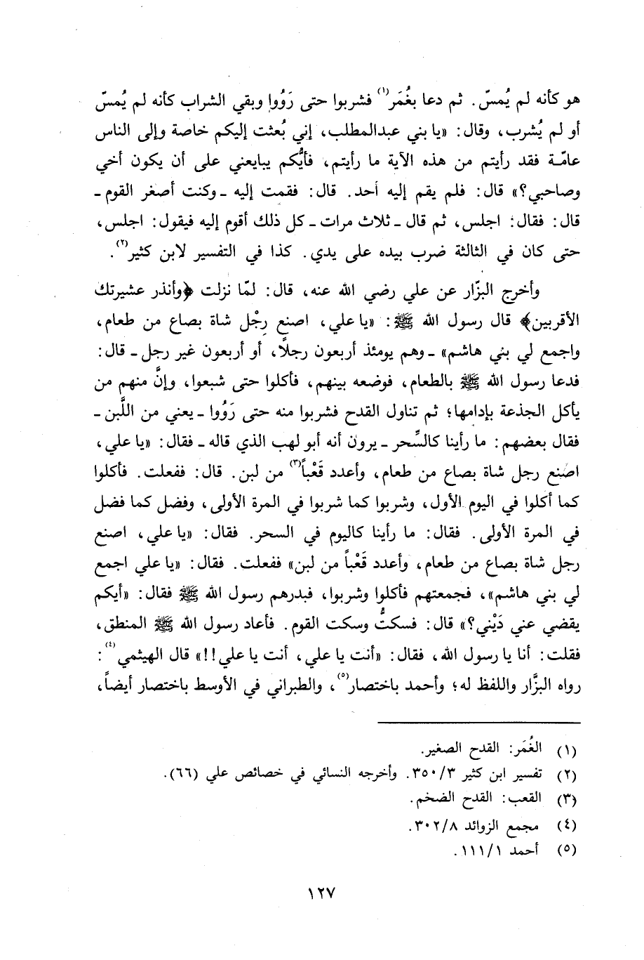 وأخرج البزّار عن علي رضي الله عنه قال: لمّا نزلت: {وَأَنذِرْ عَشِيرَتَكَ الاْقْرَبِينَ} قال رسول الله صلى الله عليه وسلم «يا علي، إصنع رِجل شاة بصاع من طعم، واجمع لي بني هاشم» - وهم يومئذٍ أربعون رجلاً، أبو أربعون غير رجل - قال: فدعا رسول الله صلى الله عليه وسلم بالطعام، فوضعه بينه. فأكلوا حتى شبعوا، وإِنَّ منهم من يأكل الجذعة بإدامها؛ ثم تناول القدح فشربوا منه حتى رُووا - يعني من اللَّبن -، فقال بعضهم: ما رأينا كالسِّحر - يروون أنه أبو لهب الذي قاله - فقال: «يا علي، إصنع رجل شاة بصاع من طعام، وأعدد قَعْباً من لبن. قال: ففعلت. فأكلوا كما أكلوا في اليوم الأول، وشربوا كما شربوا في المرة الأولى، وفضل كما فضل في المرة الأولى. فقال: ما رأينا كاليوم في السحر. فقال: «يا علي، إصنع رجل شاة بصاع من طعام، وأعدد قعباً من لبن» ففعلت. فقال: «يا علي إجمع لي بني هاشم» ، فجمعتهم فأكلوا وشربوا، فبدرهم رسول الله صلى الله عليه وسلم فقال: «أيكم يقضي عني دَيْني؟» قال: فسكتُّ وسكت القوم. فأعاد رسول الله صلى الله عليه وسلم المنطق، فقلت: أنا يا رسول الله، فقال: «أنت يا علي، أنت يا علي» قال الهيثمي: رواه البزَّار واللفظ له؛ وأحمد باختصار، والطبراني في الأوسط باختصار أيضاً،