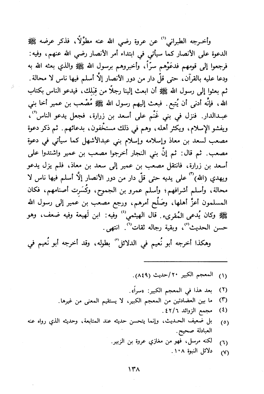 وأخرجه الطبراني عن عروة رضي الله عنه طوَّلاً، فذكر عرضه صلى الله عليه وسلم الدعوة على الأنصار كما سيأتي في ابتداء أمر الأنصار - رضي الله عنهم - وفيه: فرجعوا إلى قومهم فدعَوْهم سرّاً، وأخبروهم برسول الله صلى الله عليه وسلم والذي بعثه الله به (ودعا عليه بالقرآن) حتى قلّ دار من دور الأنصار إِلا أسلم فيها ناس لا محالة. ثم بعثوا إلى رسول الله صلى الله عليه وسلم أن أبعث إِلينا رجلاً من قِبَلك، فيدعو الناس بكتاب الله، فإنَّه أدنى أن يُتبع. فبعث إليهم رسول الله صلى الله عليه وسلم مُصْعب بن عمر أخا بني عبد الدار. فنزل في بني غَنْم على أسعد بن زرارة، فجعل يدعو الناس، ويفشو الإِسلام، ويكثر أهله، وهم في ذلك مستخْفون، بدعائهم. ثم ذكر دعوة مصعب لسعد بن معاذ وإسلامه وإسلام بني عبد الأشهل كما سيأتي في دعوة مصعب. ثم قال: ثم إِنَّ بني النجار أخرجوا مصعب بن عمير واشتدوا على أسعد بن زرارة، فانتقل مصعب بن عمير إلى سعد بن معاذ، فلم يزل يدعو ويهدي (الله) على يديه حتى قلّ دار من دور الأنصار إلا أسلم فيها ناس لا محالة، وأسلم أشرافهم، وأسلم عمرو بن الجموح، وكُسرت أصنامهم. فكان المسلمون أعزَّ أهلها، وصلح أمرهم. ورجع مصعب بن عمير إلى رسول الله صلى الله عليه وسلم وكان يُدعى المُقرىء. قال الهيثمي وفيه: ابن لَهيعة وفيه ضعف، وهو حسن الحديث، وبقية رجاله ثقات. انتهى.