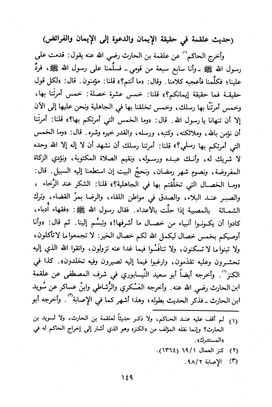 وأخرج الحاكم عن علقمة بن الحارث رضي الله عنه يقول: قدمت على رسول الله صلى الله عليه وسلم ـ وأنا سابع من قومي - فسلَّمنا على رسول الله صلى الله عليه وسلم فردَّ علينا؛ فكلَّمناه فأعجبه كلامنا. وقال: «ما أنتم؟» قلنا؛ مؤمنون. قال «لكل قول حقيقة فما حقيقة إيمانكم؟» قلنا: خمس عشرة خصلة: خمس أمرتَنا بها، وخمس أمرَتْنا بها رسلك، وخمس تخلقنا بها في الجاهلية ونحن عليها إلى الآن إلا أن تنهانا يا رسول الله. قال: «وما الخمس التي أمرتكم بها؟» قلنا: أمرتَنا أن نؤمن بالله، وملائكته، وكتبه، ورسله، والقدر خيره وشره. قال: «وما الخمس التي أمرتكم بها رسلي؟» قلنا: أمرتنا رسلك أن نشهد أن لا إله إلا الله وحده لا شريك له، وأنك عبده ورسوله، ونقيم الصلاة المكتوبة، نؤدي الزكاة المفروضة، ونصوم شهر رمضان، ونحجّ البيت إن استطعنا إليه السبيل. قال: «وما الخصال التي تخلَّقتم بها في الجاهلية؟» قلنا: الشكر عند الرَّخاء، والصبر عند البلاء، والصدق في مواطن اللقاء، والرضا بمرّ القضاء، وترك الشماتة بالمصيبة إذا حلَّت بالأعداء. فقال رسول الله صلى الله عليه وسلم «فقهاء أُدباء، كادوا أن يكونو اأنبياء من خصال ما أشرفها» وتبسَّم إِلينا. ثم قال: «أنا أوصيكم بخمس خصال ليكمل الله لكم خصال الخير: لا تجمعوا ما لا تأكلون، ولا تبنوا ما لا تسكنون، ولا تنافَسُوا فيما غدا عنه تزولون، واتقوا الله الذي إليه تحشرون وعليه تقدَمون، وارغبوا فيما إليه تصيرون وفيه تخلدون» كذا في الكنز. وأخرجه أيضاً أبو سعيد النَّيسابوري في شرف المصطفى عن علقمة بن الحارث رضي الله عنه. وأخرجه العسكري والرشاطي وابن عساكر عن سويد بن الحارث - فذكر الحديث بطوله؛ وهذا أشهر كما في الإِصابة. وأخرجه أبو