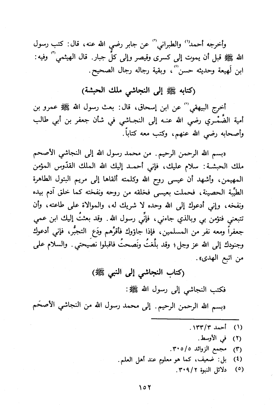 «بسم الله الرحمن الرحيم. من محمد رسول الله إِلى النجاشي الأصحم ملك الحبشة: سلام عليك، فإني أحمد إليك الله الملك القدّوس المؤمن المهيمن، وأشهد أن عيسى روح الله وكلمته ألقاها إلى مريم البتول الطاهرة الطيِّبة الحصينة، فحملت بعيسى فخلقه من روحه ونفخته كما خلق آدم بيده ونفخه، وإِني أدعوك إلى الله وحده لا شريك له، والوالاة على طاعته، وأن تتبعني فتؤمن بي وبالذي جاءني، فإنِّي رسول الله. وقد بعثت إِليك ابن عمي جعفراً ومعه نفر من المسلمين، فإذا جاؤوك فأقرَّهم ودَعِ التجبُّر، فإني أدعوك وجنودك إلى الله عزّ وجلّ؛ وقد بلَّغتُ ونَصحتُ فاقبلوا نصيحتي. والسلام على من اتبع الهدى» .