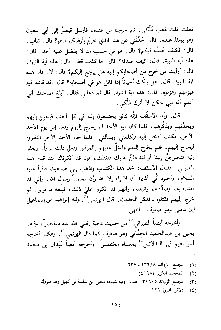 قال: وأما الأسقُف فإنَّه كانوا يجتمعون إِليه في كل أحد، يخرج إليهم ويحدِّثهم ويذكِّرهم، فلما كان يوم الأحد لم يخرج إليهم وقعد إلى يوم الأحد الآخر، فكنت أدخل إليه فيكلمني ويسألني. فلما جاء الأحد الآخر إنتظروه ليخرح إليه، فلم يخرج إِليهم واعتلَّ عليهم بالمرض وفعل ذلك مراراً. وبعثوا إليه لتخرجنَّ إلينا أو لندخلنَّ عليك فنقتلك، فإنا قد أنكرناك منذ قدم هذا العربي. فقال الأسقف: خذ هذا الكتاب واذهب إلى صاحبك فاقرأ عليه السلام، وأخبره أنِّي أشهد أن لا إله إِلا الله وأن محمداً رسول الله، وأني قد آمنت به، وصدَّقته، واتبعته، وأنهم قد أنكروا عليّ ذلك، فبلِّغه ما ترى. ثم خرج إليهم فقتلوه - فذكر الحديث. قال الهيثمي (8236 - 237) وفيه إبراهيم بن إسماعيل بن يحيى وهو ضعيف. انتهى.