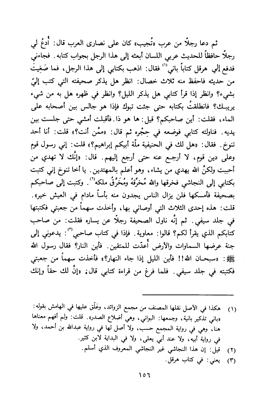 ثم دعا رجلاً من عرب «تُجيب» كان على نصارى العرب قال: أُدُع لي رجلاً حافظاً للحديث عربي اللسان أبعثه إلى هذا الرجل بجواب كتابه. فجاءني فدفع إليّ هرقل كتاباً باني فقال: إذهب بكتابي إلى هذا الرجل، فما صَغِيتَ من حديثه فاحفظ منه ثلاث خصال: أنظر هل يذكر صحيفته التي كتب إليّ بشيء؟ وانظر إذا قرأ كتابي هل يذكر الليل؟ وانظر في ظهره هل به من شيء يريبك؟ فانطلقتُ بكتابه حتى جئت تبوك فإذا هو جالس بين أصحابه على الماء، فقلت: أين صاحبكم؟ قي: ها هوذا. فأقبلت أمشي حتى جلست بين يديه. فناولته كتابي فوضعه في حِجْره ثم قال: «ممَّن أنت؟» قلت: أنا أحد تنوخ. فقال: «هل لك في الحنيفية ملّة أبيكم إبراهيم؟» قلت: إني رسول قوم وعلى دين قوم، لا أرجع عنه حتى أرجع إليهم. قال: «إنَّك لا تهدي من أحببت ولكنَّ الله يهدي من يشاء، وهو أعلم بالمهتدين. يا أخا تنوخ إني كتبت بكتابي إلى النجاشي فخرقها والله مُخرِّقهُ ومُخَرِّقُ ملكه. وكتب إلى صاحبكم بصحيفة فأمسكها فلن يزال الناس يجدون منه بأساً ما دام في العيش خير» . قلت: هذه إحدى الثلاثة التي أوصاني بها، وأخذت سهماً من جعبتي فكتبتها في جلد سيفي. ثم إنَّه ناول الصحيفة رجلاً عن يساره فقلت: من صاحب كتابكم الذي يقرأ لكم؟ قالوا: معاوية. فإذا في كتاب صاحبي: يدعوني إلى جنة عرضها السماوات والأرض أُعدّت للمتقين. فأين النار؟ فقال رسول الله صلى الله عليه وسلم «سبحان الله فأين الليل إِذا جاء النهار؟» فأخذت سهماً من جعبتي فكتبته في جلد سيفي. فلما فرغ من قراءة كتابي قال: «إنَّ لك حقاً وإنك