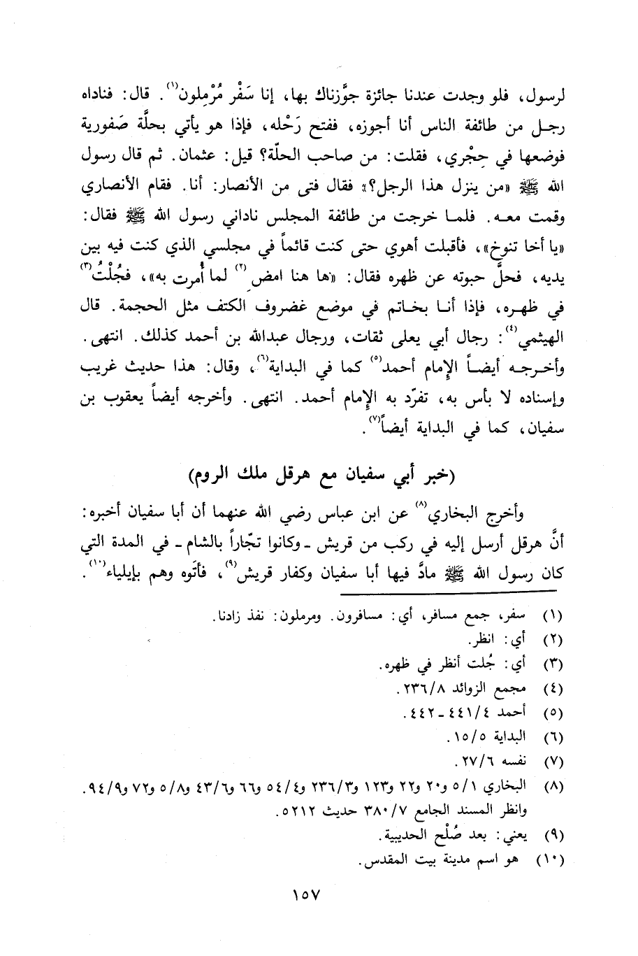 وأخرج البخاري عن ابن عباس رضي الله عنهما أن أبا سفيان أخبره: أنَّ هرقل أرسل إليه في ركب من قريش - وكانوا تجّاراً بالشام - في المدة التي كان رسول الله صلى الله عليه وسلم مادَّ فيها أبا سفيان وكفار قريش، فأتَوه وهم بإيلياء.