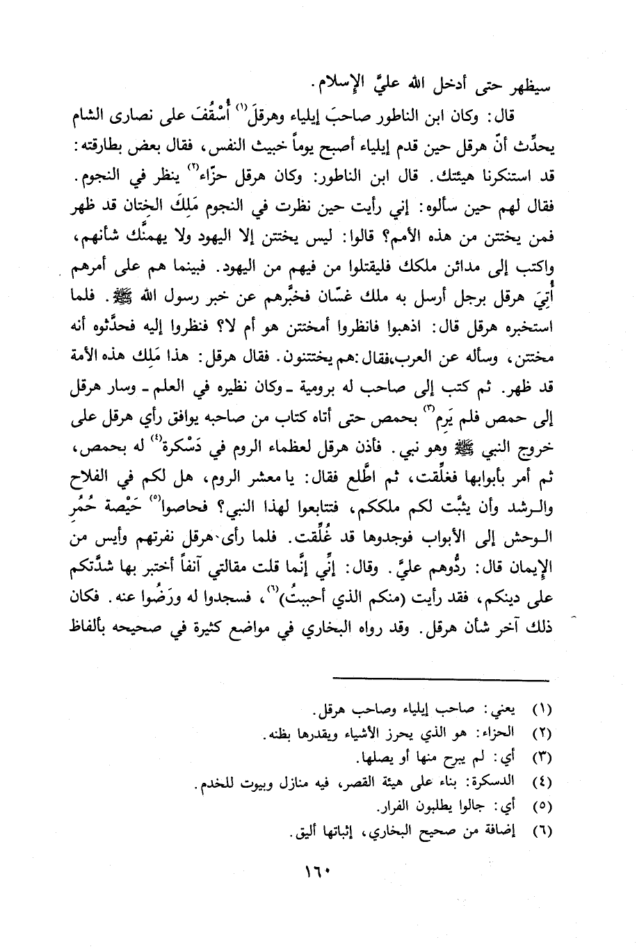قال: وكان ابن الناطور صاحبَ إيلياء وهرقَل أُسْقُفَ على نصارى الشام يحدِّث أنّ هرقل حين قدم إيلياء أصبح يوماً خبيث النفس، فقال بعض بطارقته: قد استنكرنا هيئتك. قال ابن الناطور: وكان هرقل حزّاء ينظر في النجوم. فقال لهم حين سألوه: إني رأيت حين نظرت في النجوم مَلِكَ الخِتان قد ظهر فمن يختتن من هذه الأمم؟ قالوا: ليس يختتن إلا اليهود ولا يهمنَّك شأنهم، واكتب إلى مدائن ملكك فليقتلوا من فيهم من اليهود. فبينما هم على أمرهم أُتِيَ هرقل برجل أرسل به ملك غسّان فخبَّرهم عن خبر رسول الله صلى الله عليه وسلم فلما استخبره هرقل قال: إذهبا فانظروا أمختتن هو أم لا؟ فنظروا إليه فحدَّثوه أنه مختتن، وسأله عن العرب فقال هم يختتنون. فقال هرقل: هذا مَلِك هذه الأمة قد ظهر. ثم كتب إلى صاحب له برومية - وكان نظيره في العلم - وسار هرقل إلى حمص فلم يَرِم بحمص حتى أتاه كتاب من صاحبه يوافق رأي هرقل على خروج النبي صلى الله عليه وسلم وهو نبي. فأذن هرقل لعظماء الروم في دَسْكرة له بحمص، ثم أمر بأبوابها فغلِّقت، ثم اطَّلع فقال: يا معشر الروم، هل لكم في الفلاح والرشد وأن يثبَّت لكم ملككم، فتتابعوا لهذا النبي؟ فحاصوا حَيْصة حُمُرِ الوحش إلى الأبواب فوجدوها قد غُلِّقت. فلما رأى هرقل نفرتهم وأيس من الإِيمان قال: ردُّوهم عليَّ. وقال: إنِّي إنَّما قلت مقالتي آنفاً أختبر بها شدَّتكم على دينكم؛ فقد رأيت، فسجدوا له ورَضُوا عنه. فكان ذلك آخر شأن هرقل. وقد رواه البخاري في مواضع كثيرة في صحيحه بألفاظ