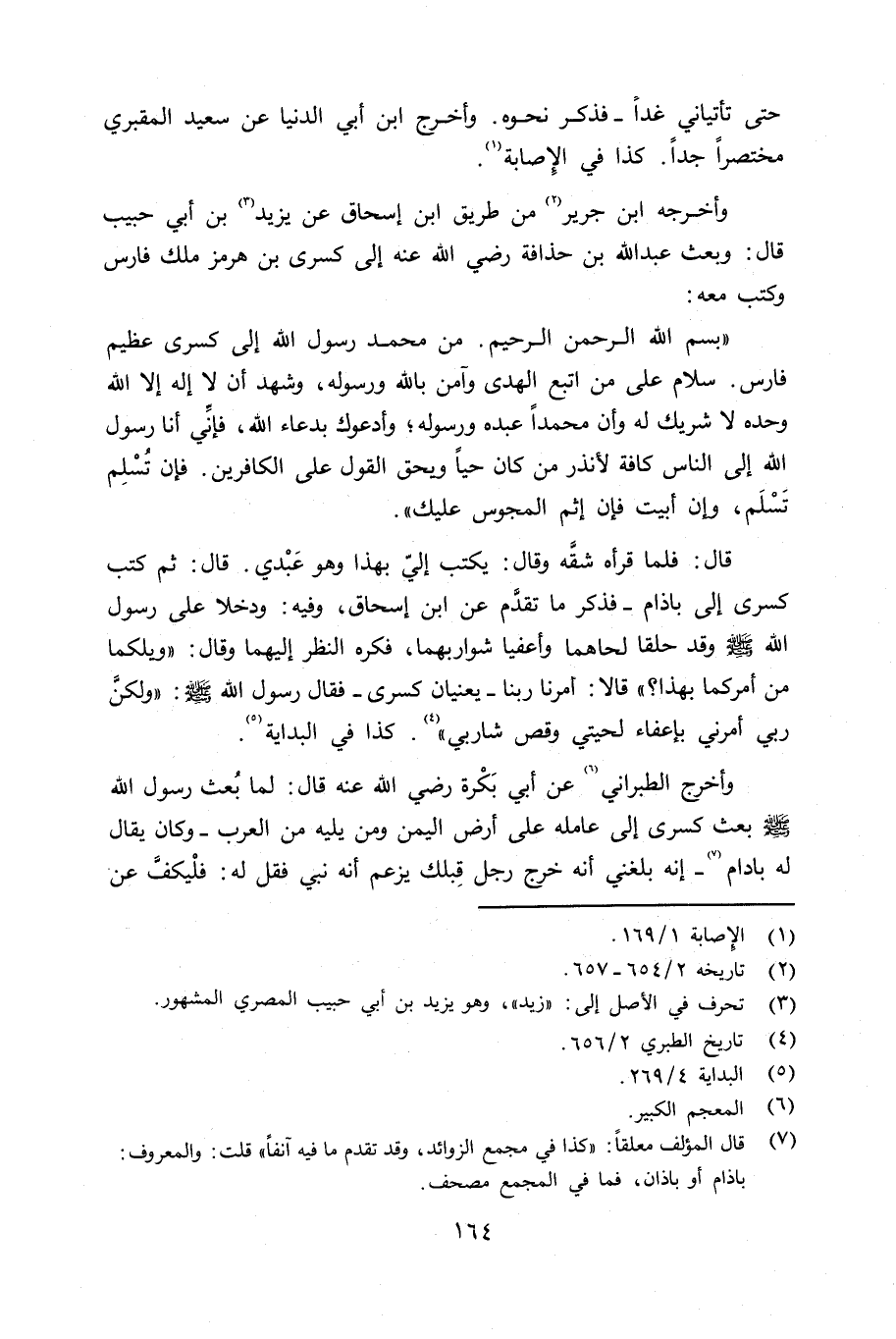 «بسم الله الرحمن الرحيم. من محمد رسول الله إلى كسرى عظيم فارس. سلام على من اتبع الهدى وآمن بالله ورسوله، وشهد أن لا إله إلا الله وحده لا شريك له وأن محمداً عبده ورسوله؛ وأدعوك بدعاء الله، فإنِّي أنا رسول الله إلى الناس كافة لأنذر من كان حياً ويحق القول على الكافرين. فإن تُسْلِم تَسلَم، وإن أبيت فإن إثم المجوس عليك» .