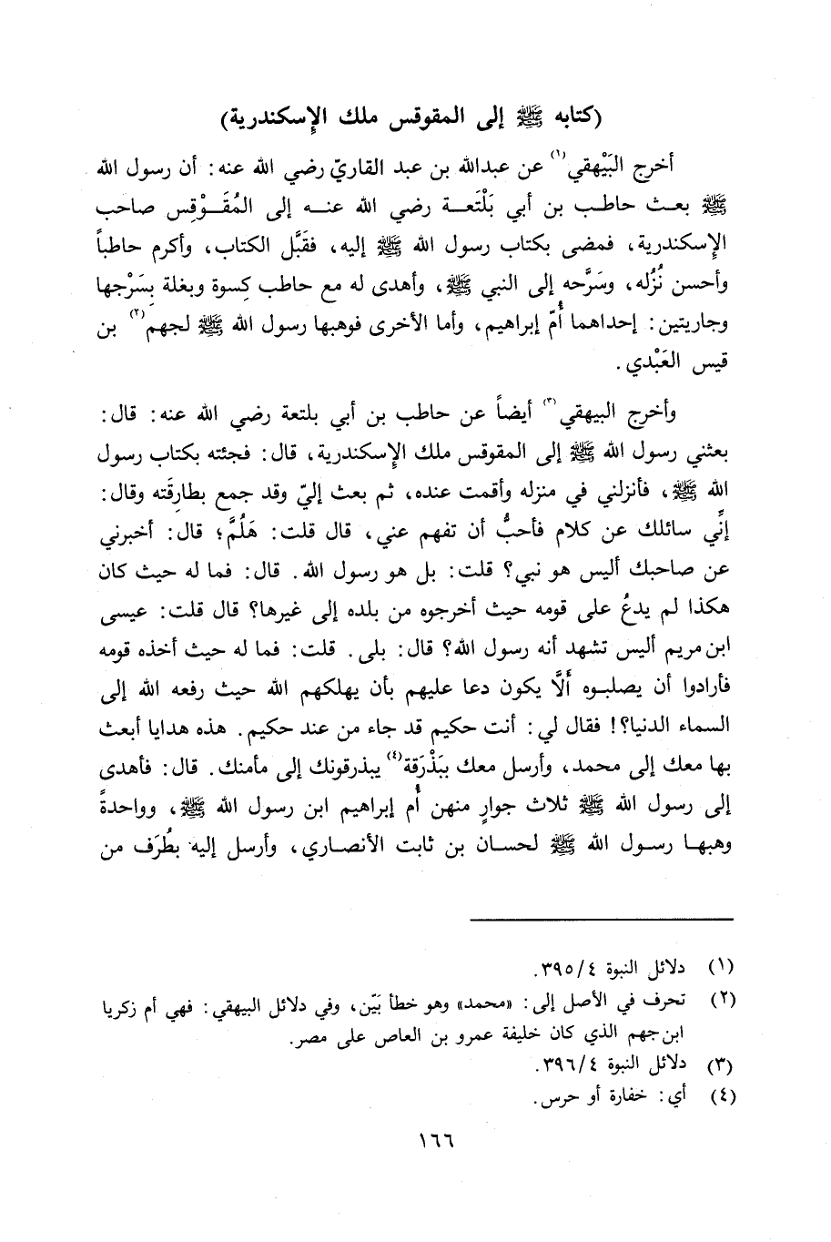 وأخرج البيهقي أيضاً عن حاطب بن أبي بلتعة رضي الله عنه قال: بعثني رسول الله صلى الله عليه وسلم إلى المقوقس ملك الإِسكندرية، قال: فجئته بكتاب رسول الله صلى الله عليه وسلم فأنزلني في منزله وأقمت عنده، ثم بعث إليّ وقد جمع بطارِقَته وقال: إنِّي سائلك عن كلام فأحبُّ أن تفهم عني، قال قلت: هلُمَّ؛ قال: أخبرني عن صاحبك ألي هو نبي؟ قلت: بل هو رسول الله قال: فما له حيث كان هكذا لم يدعُ على قومه حيث أخرجوه من بلده إلى غيرها؟ قال قلت: عيسى بن مريم أليس تشهد أنه رسول الله؟ قال: بلى. قلت: فما له حيث أخذه قومه فأرادوا أن يصلبوه ألا يكون دعا عليهم بأن يهلكه الله حيث رفعه الله إلى السماء الدنيا؟ فقال لي: أنت حكيم قد جاء من عند حكيم. هذه هدايا أبعث بها معك إلى محمد، وأرسل معك ببَذْرَقة يبذرقونك إلى مأمنك.