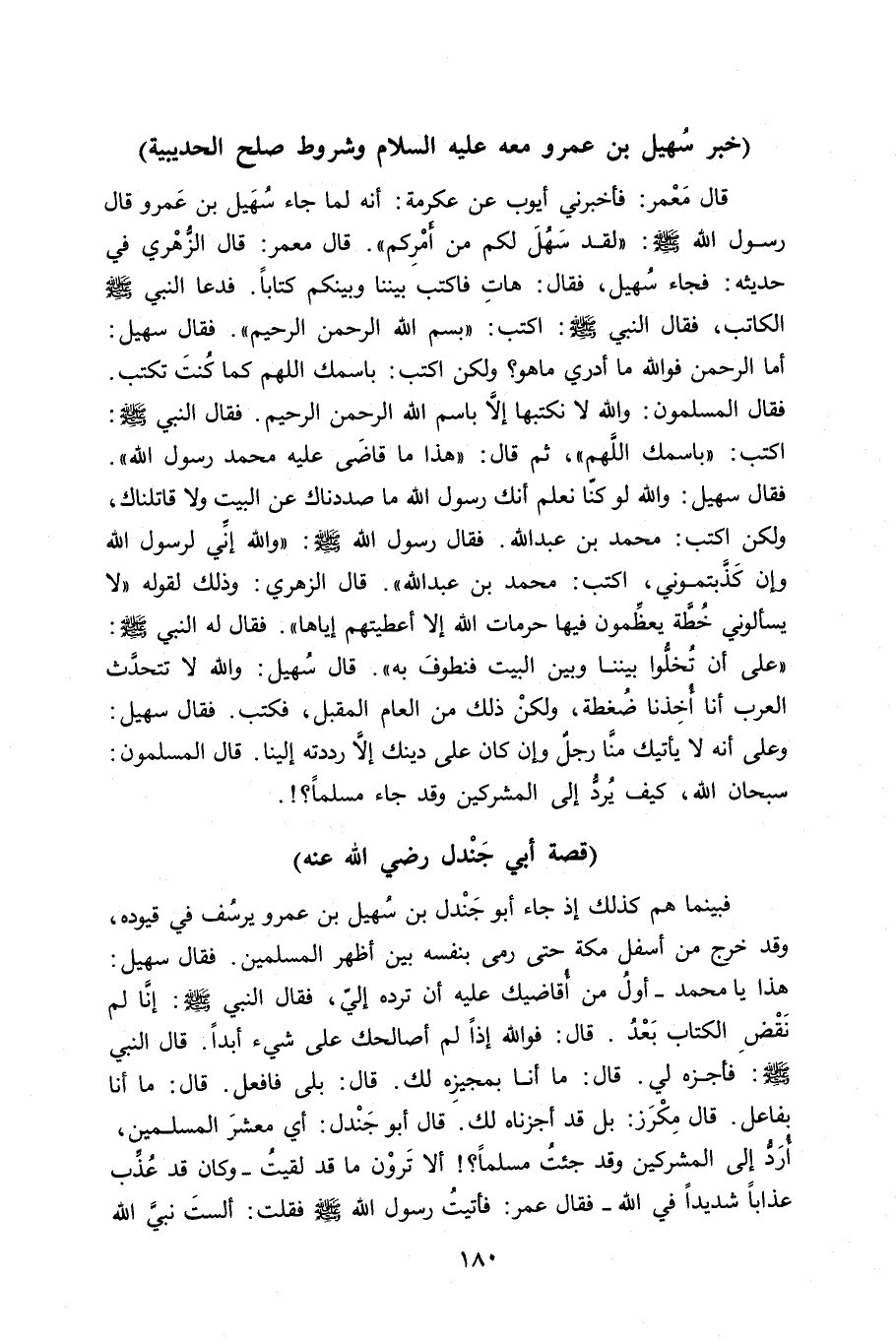 فقال سهيل: أما الرحمن فوالله ما أدري ما هو؟ ولكن أكتب: باسمك اللهم كما كنت تكتب. فقال المسلمون: والله لا نكتبها إلا باسم الله الرحمن الرحيم. فقال النبي صلى الله عليه وسلم أكتب: «باسمك اللَّهم» ، ثم قال: «هذا ما قاضَى عليه محمد رسول الله» . فقال سهيل: والله لو كنَّا نعلم أنك رسول الله ما صددناك عن البيت ولا قاتلناك، ولكن أكتب: محمد بن عبد الله. فقال رسول الله صلى الله عليه وسلم «والله إنِّي لرسول الله وإن كذبتموني، أكتب: محمد بن عبد الله» . - قال الزُهري: وذلك لقوله لا يسألوني خطَّة يعظِّمون فيه حرمت الله إلا أعطيتهم إياها -. فقال له النبي صلى الله عليه وسلم «على أن تُخلُّوا بيننا وبين البيت فنطوف به» . قال سهيل: والله لا تتحدَّث العرب أنا أُخِذنا ضَغْطة، لكنَّ ذلك من العام المقبل، فكتب. فقال سهيل: وعلى أنه لا يأتيك منَّا رجل وإن كان على دينك إلاَّ رددته إلينا. قال المسلمون: سبحان الله، كيف يُردُّ إلى المشركين وقد جاء مسلماً؟.