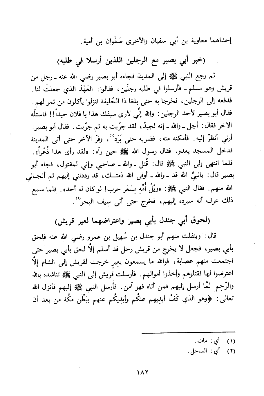 ثم رجع النبي صلى الله عليه وسلم إلى المدينة فجاءه أبو بصير رضي الله عنه - رجل من قريش وهو مسلم - فأرسلوا في طلبه رجلَين، فقالوا: العَهْدَ الذي جعلت لنا. فدفعه إلى الرجلين، فخرجا به حتى بلغا ذا الحُليفة فنزلوا يأكلون من تمر لهم. فقال أبو بصير لأحد الرجلين: والله إنِّي لأرى سيفك هذا يا فلان جيداً فاستلّه الآخر فقال: أجل - والله - إنه لجيدٌ، لقد جرّبت به ثم جرّبت. فقال أبو بصير: أرني أنظرْ إليه. فأمكنه منه، فضربه حتى بَرَد، وفرّ الآخر حتى أتى المدينة فدخل المسجد يعدو، فقال رسول الله صلى الله عليه وسلم حين رآه: «لقد رأى هذا ذُعْراً» . فلما انتهى إلى النبي صلى الله عليه وسلم قال: «قُتل - والله - صاحبي وإني لمقتول، فجاء أبو بصير فقال: يا نبي الله قد - والله - أوفى الله ذمتك، قد رددتني إليهم ثم أنجاني الله منهم. فقال النبي صلى الله عليه وسلم «ويْلُ أُمِّهِ مِسْعَر حرب لو كان له أحد» . فلما سمع ذلك عرف أنه سيرده إليهم، فخرج حتى أتى سِيف البحر.