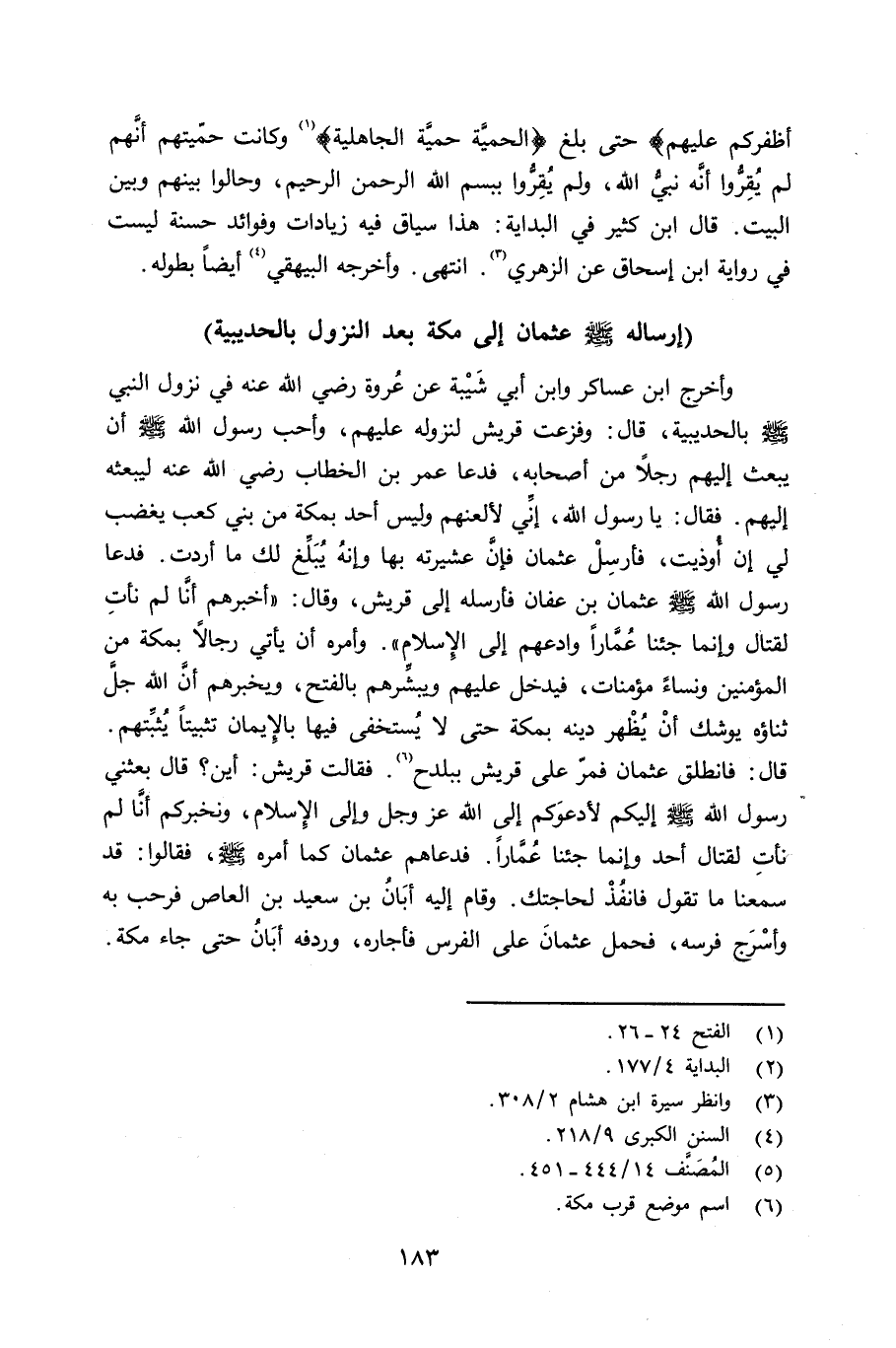 وأخرج ابن عساكر، وابن أبي شَيْبة عن عُروة رضي الله عنه في نزول النبي صلى الله عليه وسلم بالحديبية قال: وفزعت قريش لنزوله عليهم، وأحب رسول الله صلى الله عليه وسلم أن يبعث إليهم رجلاً من أصحابه، فدعا عمر بن الخطاب رضي الله عنه ليبعثه إليه. فقال: يا رسول الله، إنِّي لألعنهم وليس أحد بمكة من بني كعب يغضب لي إِن أُوذيت، فأرسِلْ عثمان فإنَّ عشيرته بها وإِنهُ يُبَلِّغ لك ما أردت. فدعا رسول الله صلى الله عليه وسلم عثمان بن عفان فأرسله إلى قريش، وقال: «أخبرهم أنَّا لم نأتِ لقتال وإنما جئنا عُمَّاراً وأدعهم إلى الإِسلام» . وأمره أن يأتي رجالاً بمكة من المؤمنين وسناءً مؤمنات، فيدخل عليهم ويبشِّرهم بالفتح، ويخبرهم أنَّ الله جلَّ ثناؤه يوكش أنْ يُظْهر دنيه بمكة حتى لا يُستخفى فيها بالإِيمان تثبيتاً يُثبِّته. قال: فانطلق عثمان فمرّ على قريش ببلدح. فقالت قريش: أين؟ قال: بعثني رسول الله صلى الله عليه وسلم إِليكم لأدعوَكم إلى الله عزّ وجلّ وإلى الإِسلام، ونخبرك أنَّا لم نأتِ لقتال أحد وإنما جئنا عُمَّاراً. فدعاهم عثمان كما أمره صلى الله عليه وسلم فقالوا: قد سمعنا ما تقول فانفُذْ لحاجتك. وقام إليه أبَانُ بن سعيد بن العاص فرحب به وسْرَج فرسه، فحمل عثمانَ على الفرس فأجاره، وردفه أبَانُ حتى جاء مكة.