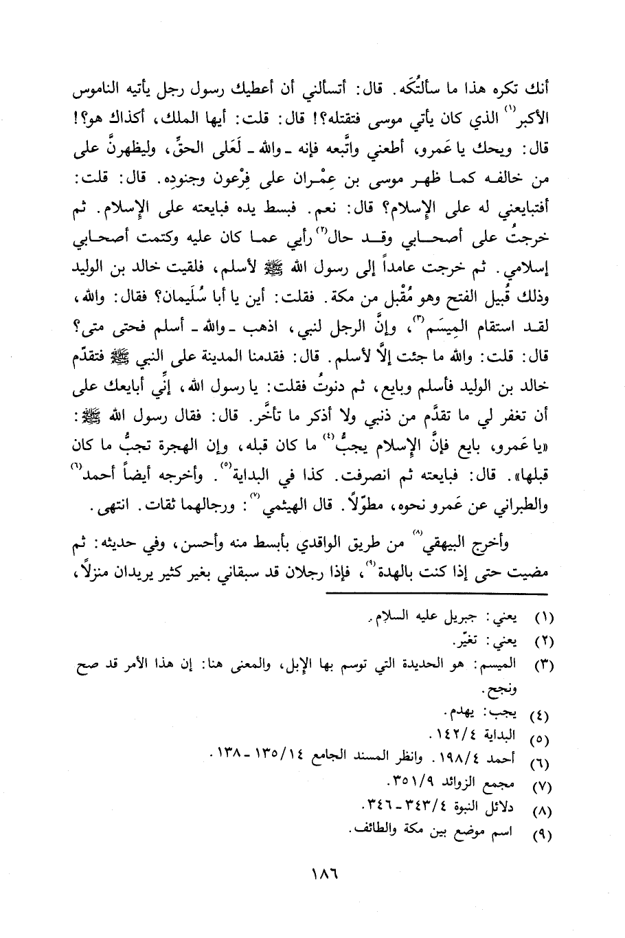أنك تكره هذا ما سألتُكَه. قال: أتسألني أن أعطيك رسول رجل يأتيه الناموس الأكبر الذي كان يأتي موسى فتقتله؟ قال قلت: أيها الملك، أكذاك هو؟ قال: ويحك يا عمرو، أطعني واتَّبعه فإنه - والله - لَعَلى الحقِّ، وليظهرنَّ على من خالفه كما ظهر موسى بن عمران على